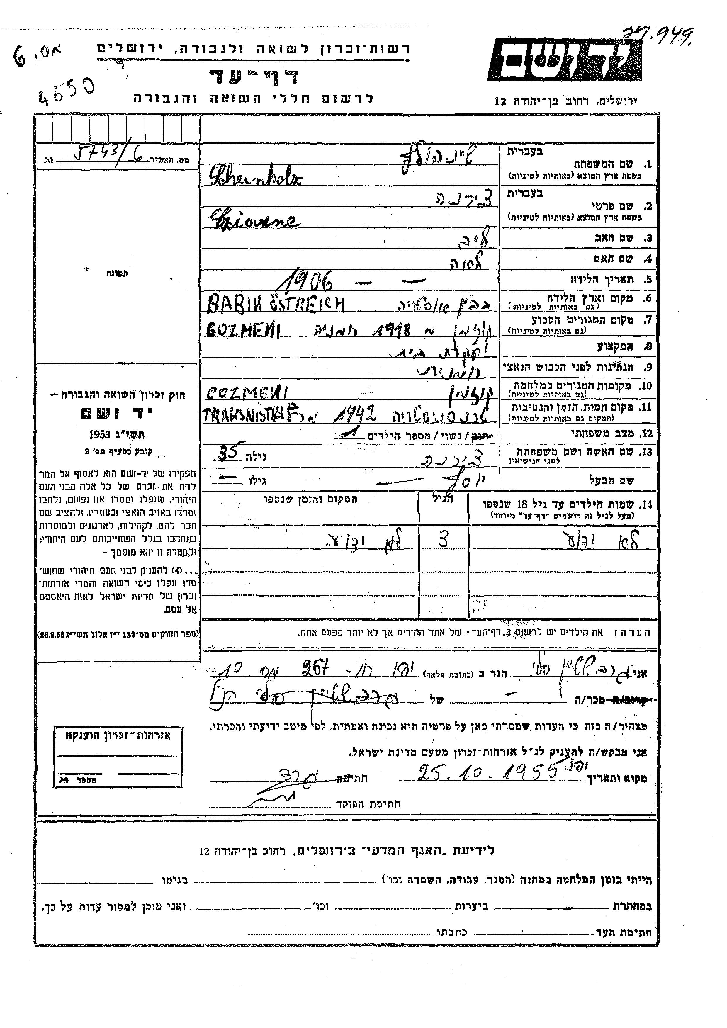 Vorname unbekannt Scheinholz wurde Er/sie war der/ die Sohn/Tochter von Yosef und Sziarne Charna. Er/Sie war Kind. Vor dem Zweiten Weltkrieg er/sie in Cozmeni, Rumänien. Während des Krieges war er/sie in Cozmeni, Rumänien.