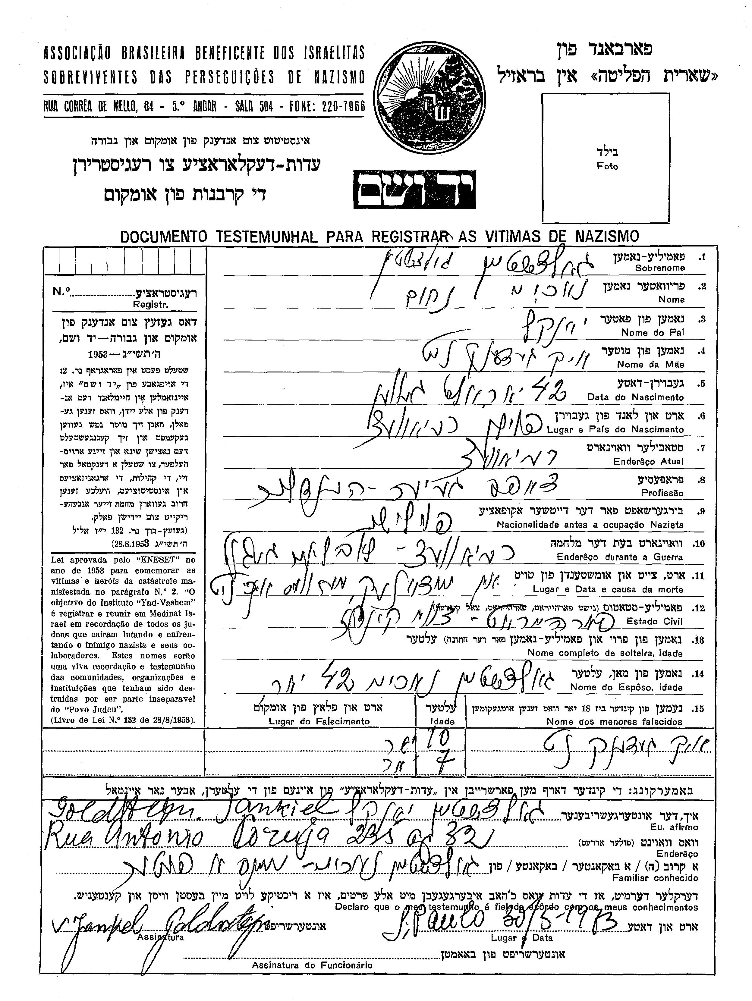 Goldshtein Vorname unbekannt Rejowiec, Polen Gedenkblatt