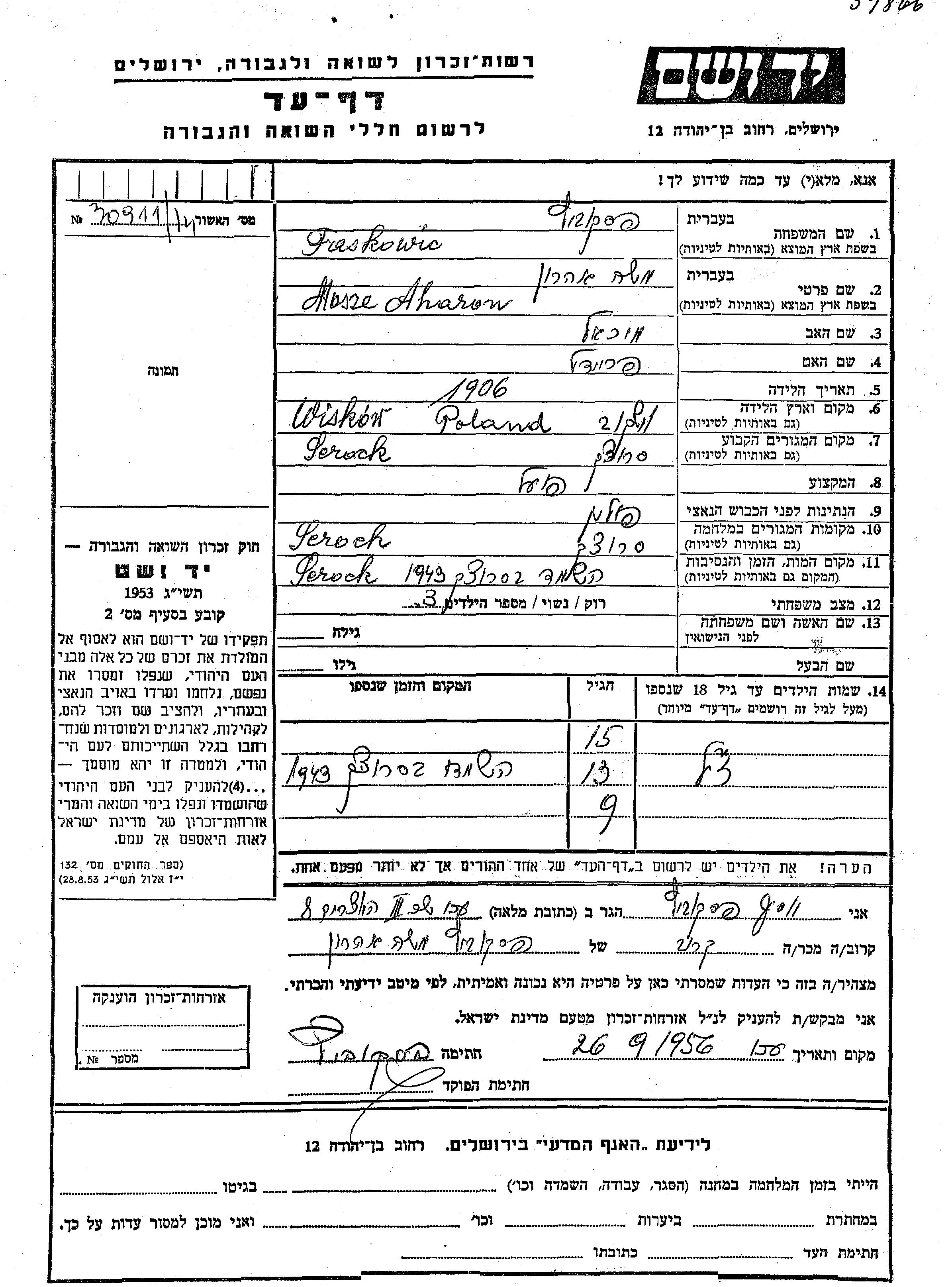 Vorname unbekannt Faskowic Paskovitz wurde Er/sie war der/ die Sohn/Tochter von Mosze Aharon. Er/Sie war Kind. Vor dem Zweiten Weltkrieg er/sie in Serock, Polen. Während des Krieges war er/sie in Serock, Polen.