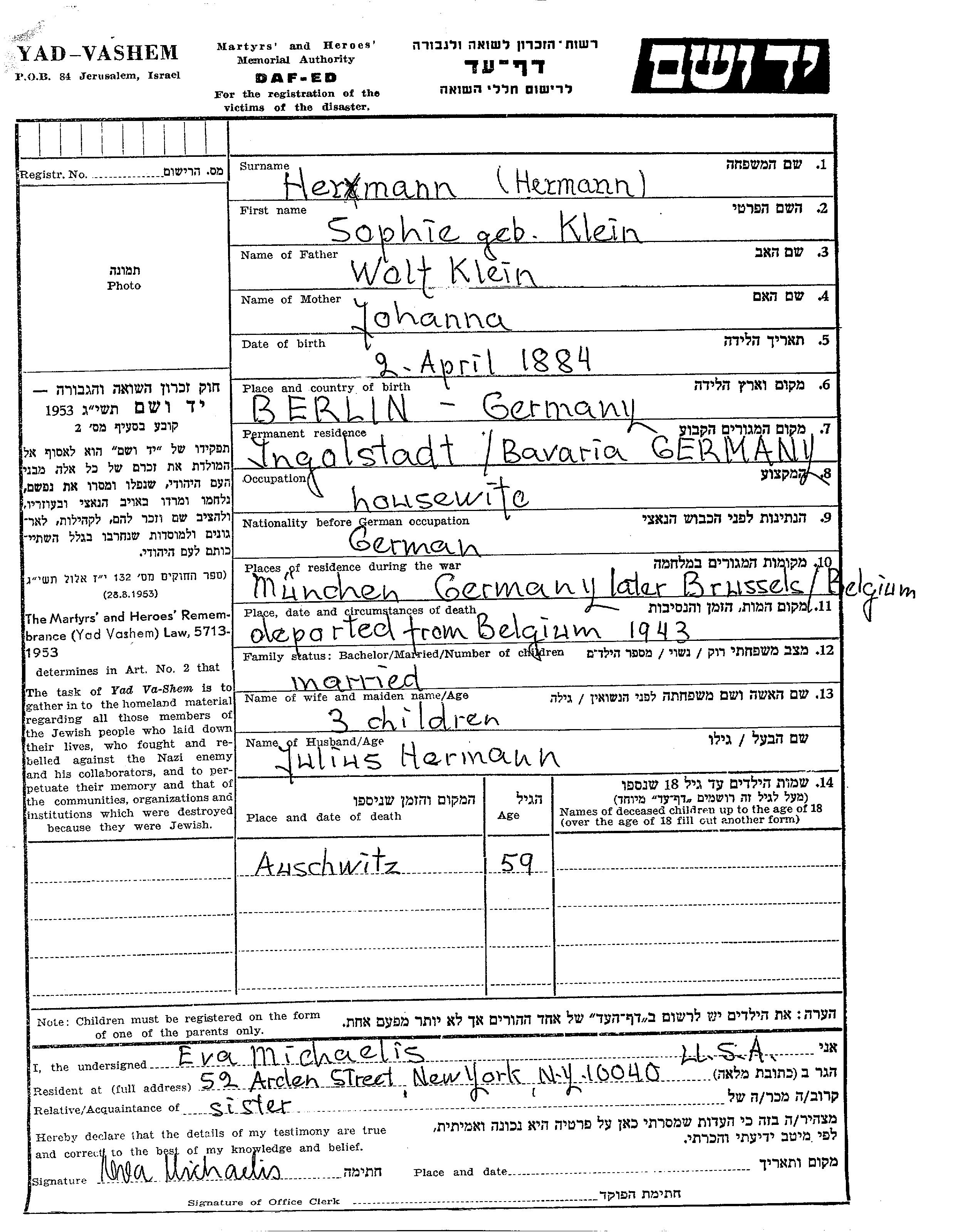 Vorname unbekannt Herman wurde Er/sie war der/ die Sohn/Tochter von Julius und Sophie, geb. Klein. Vor dem Zweiten Weltkrieg er/sie in Ingolstadt, Deutsches Reich. Während des Krieges war er/sie in Munchen, Deutsches Reich.