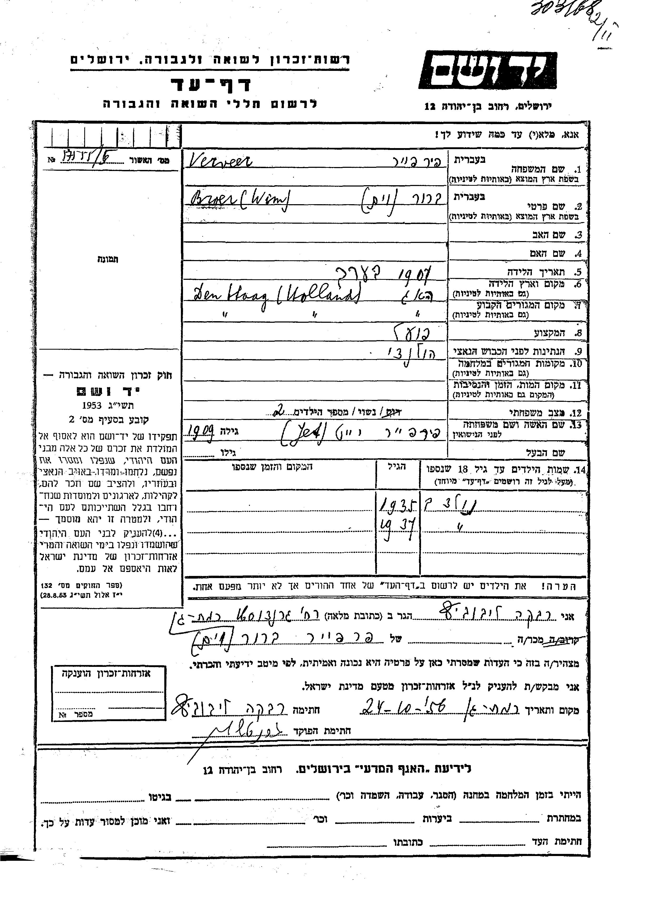 Verveer Vorname unbekannt 1937 Den Haag, Niederlande Gedenkblatt