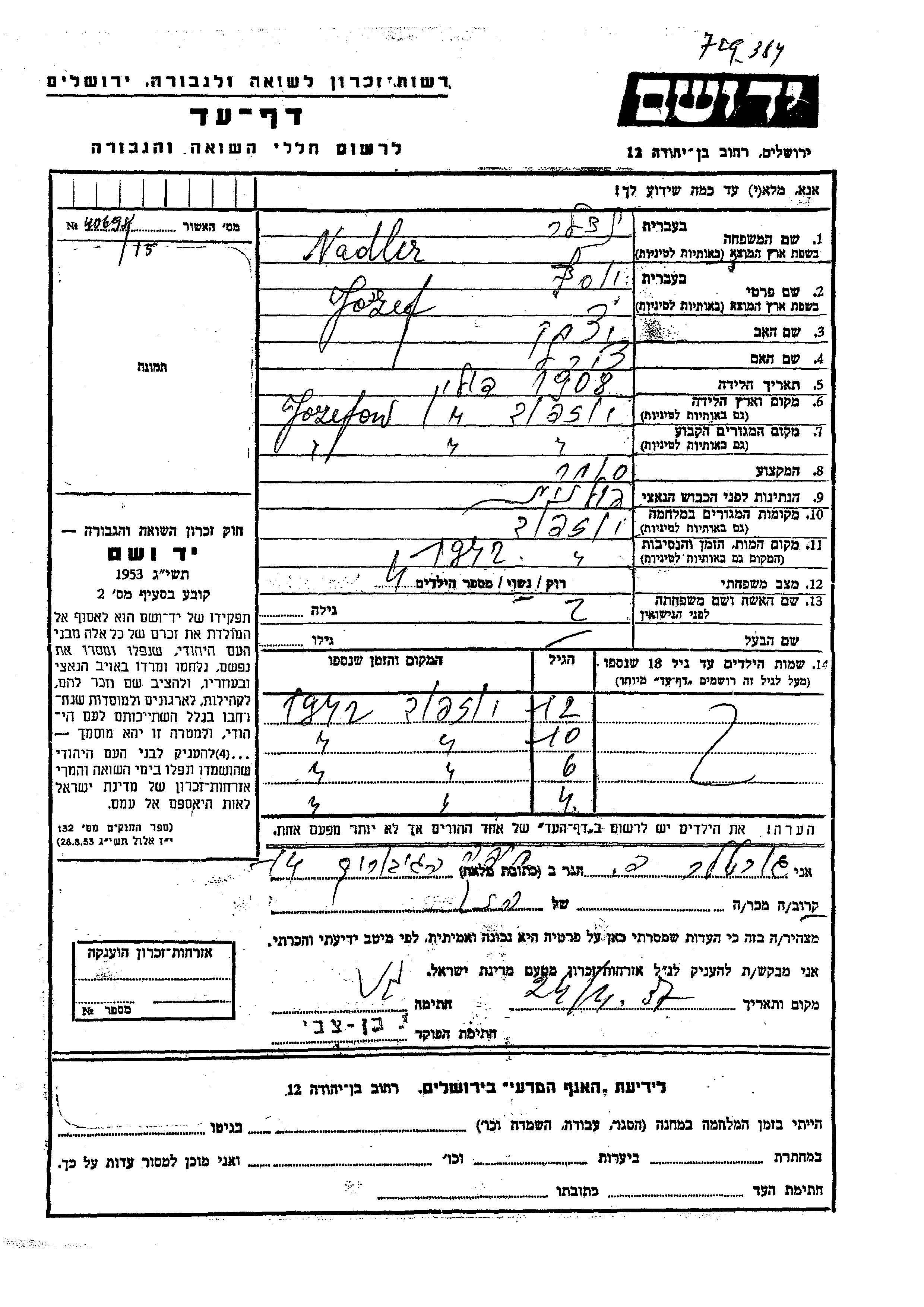 Vorname unbekannt Nadler wurde Er/sie war der/ die Sohn/Tochter von Jozef. Er/Sie war Kind. Vor dem Zweiten Weltkrieg er/sie in Jozefow, Polen. Während des Krieges war er/sie in Jozefow, Polen.