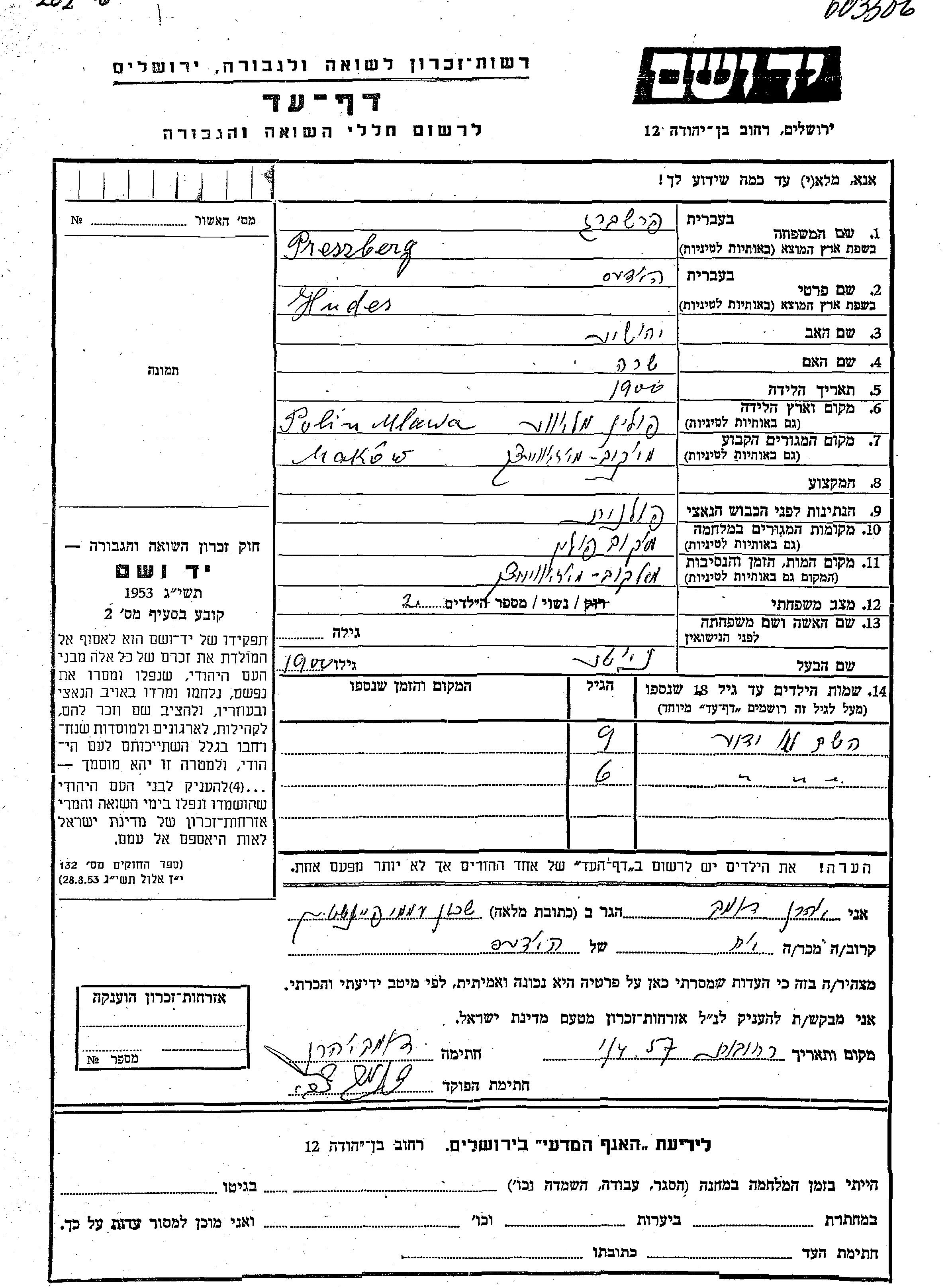 Vorname unbekannt Preszberg Frishberg wurde Er/sie war der/ die Sohn/Tochter von Natan und Hades. Er/Sie war Kind. Vor dem Zweiten Weltkrieg er/sie in Makow Mazowiecki, Polen. Während des Krieges war er/sie in Makow Mazowiecki, Polen.