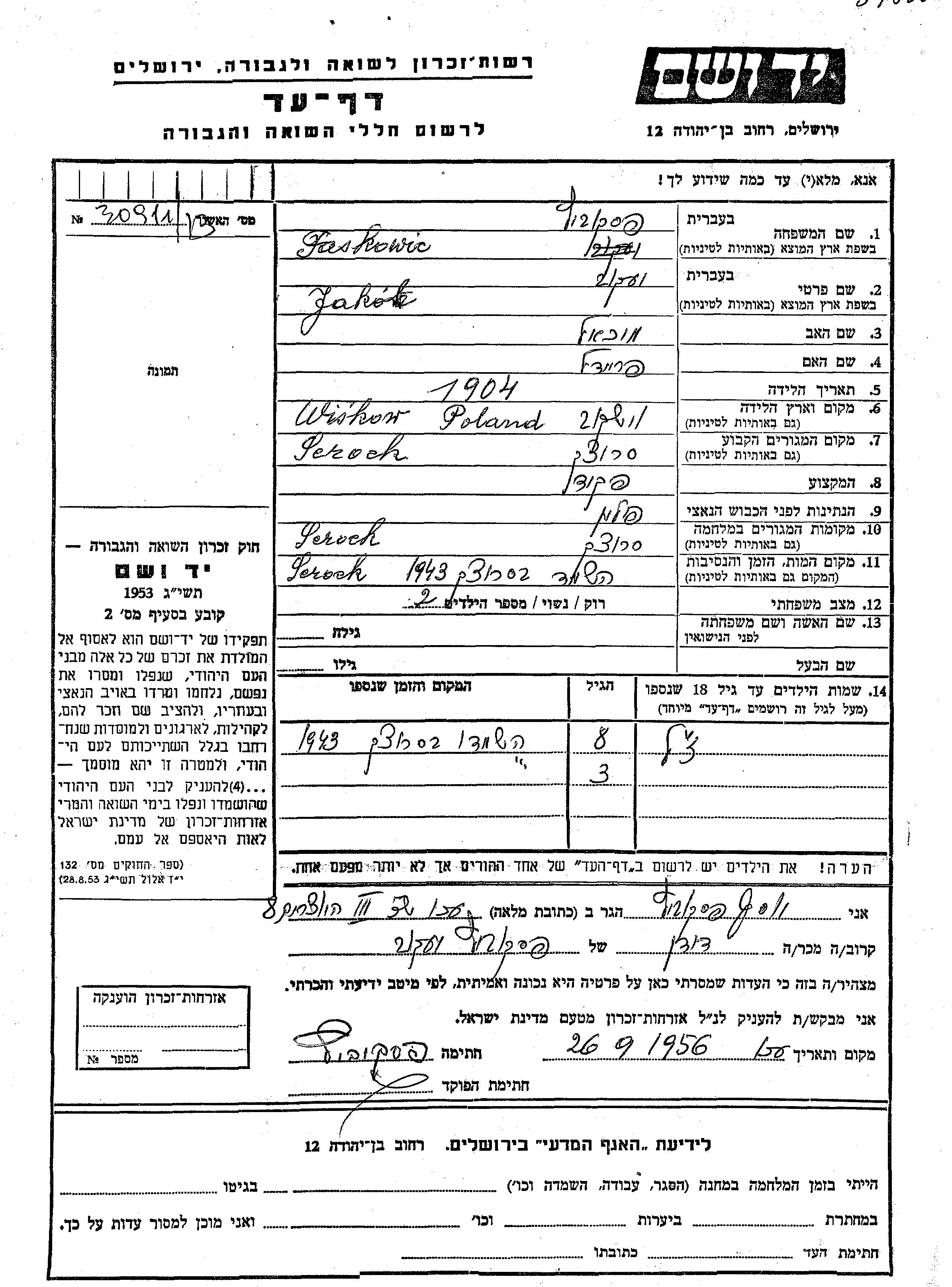 Vorname unbekannt Faskowic Paskovitz wurde Er/sie war der/ die Sohn/Tochter von Jakob. Er/Sie war Kind. Vor dem Zweiten Weltkrieg er/sie in Serock, Polen. Während des Krieges war er/sie in Serock, Polen.