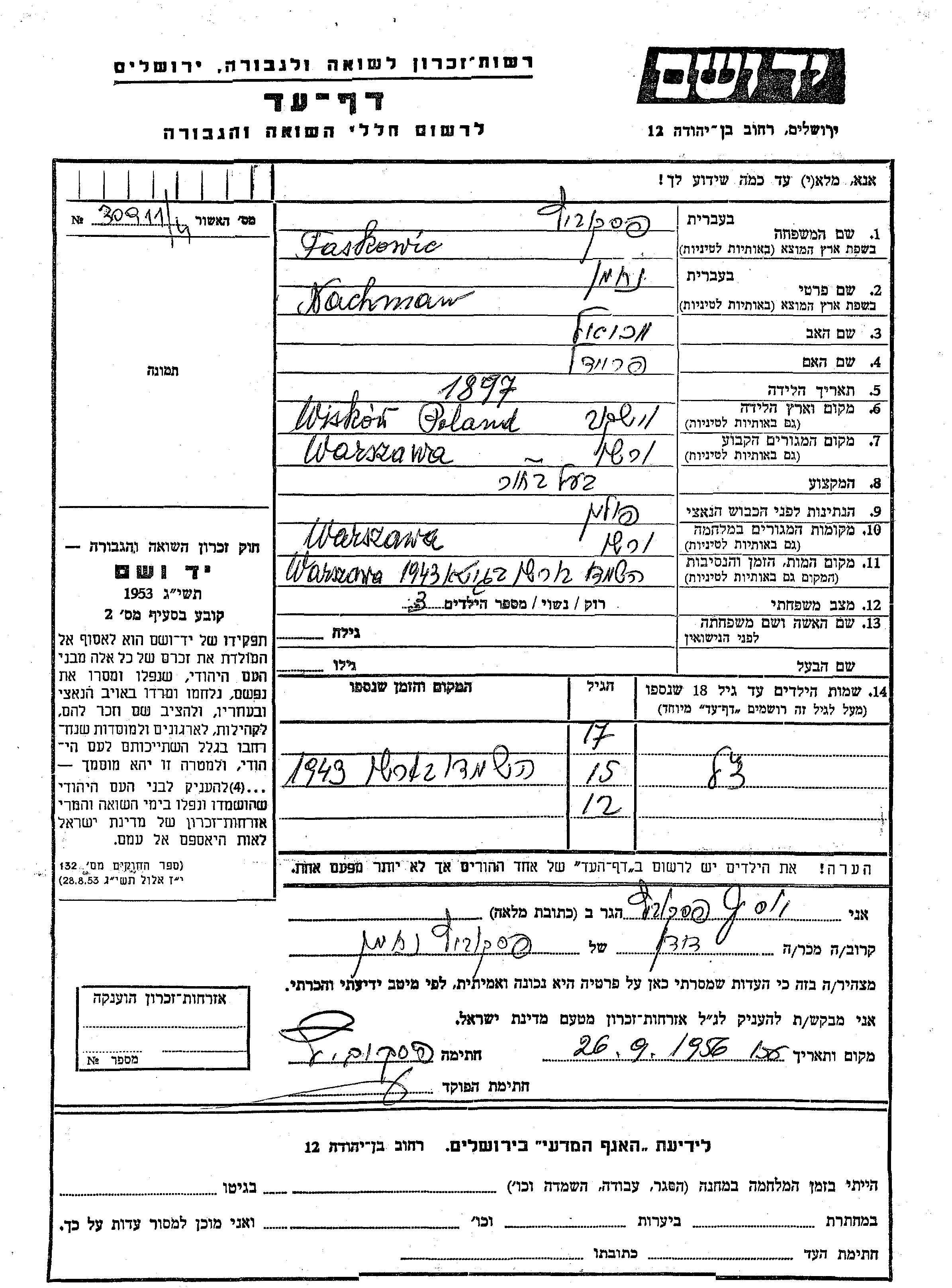 Vorname unbekannt Faskowic Paskovitz wurde Er/sie war der/ die Sohn/Tochter von Nachman. Er/Sie war Kind. Vor dem Zweiten Weltkrieg er/sie in Warszawa, Polen. Während des Krieges war er/sie in Warszawa, Polen.