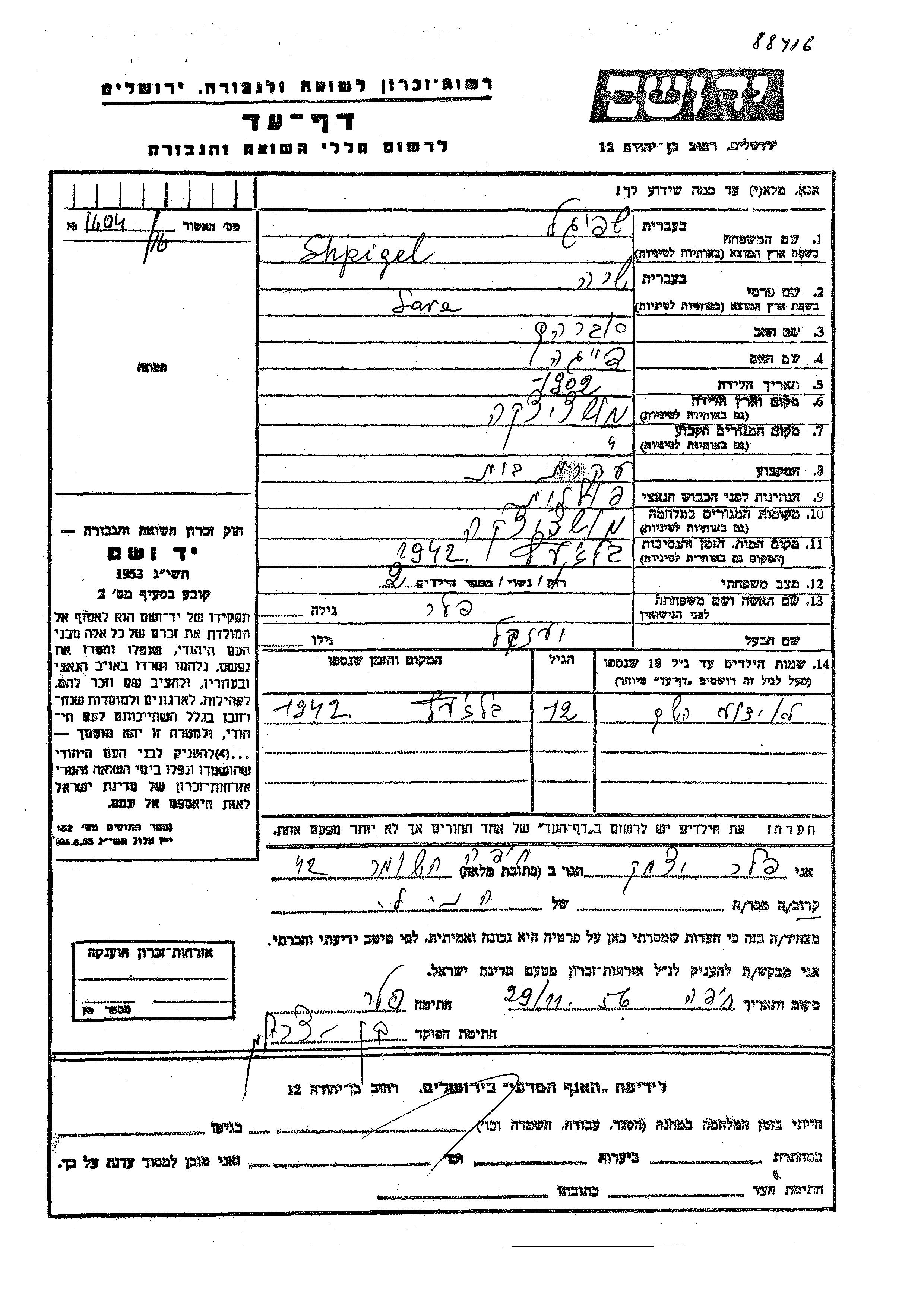 Shpigel Vorname unbekannt Mosciska, Polen Gedenkblatt