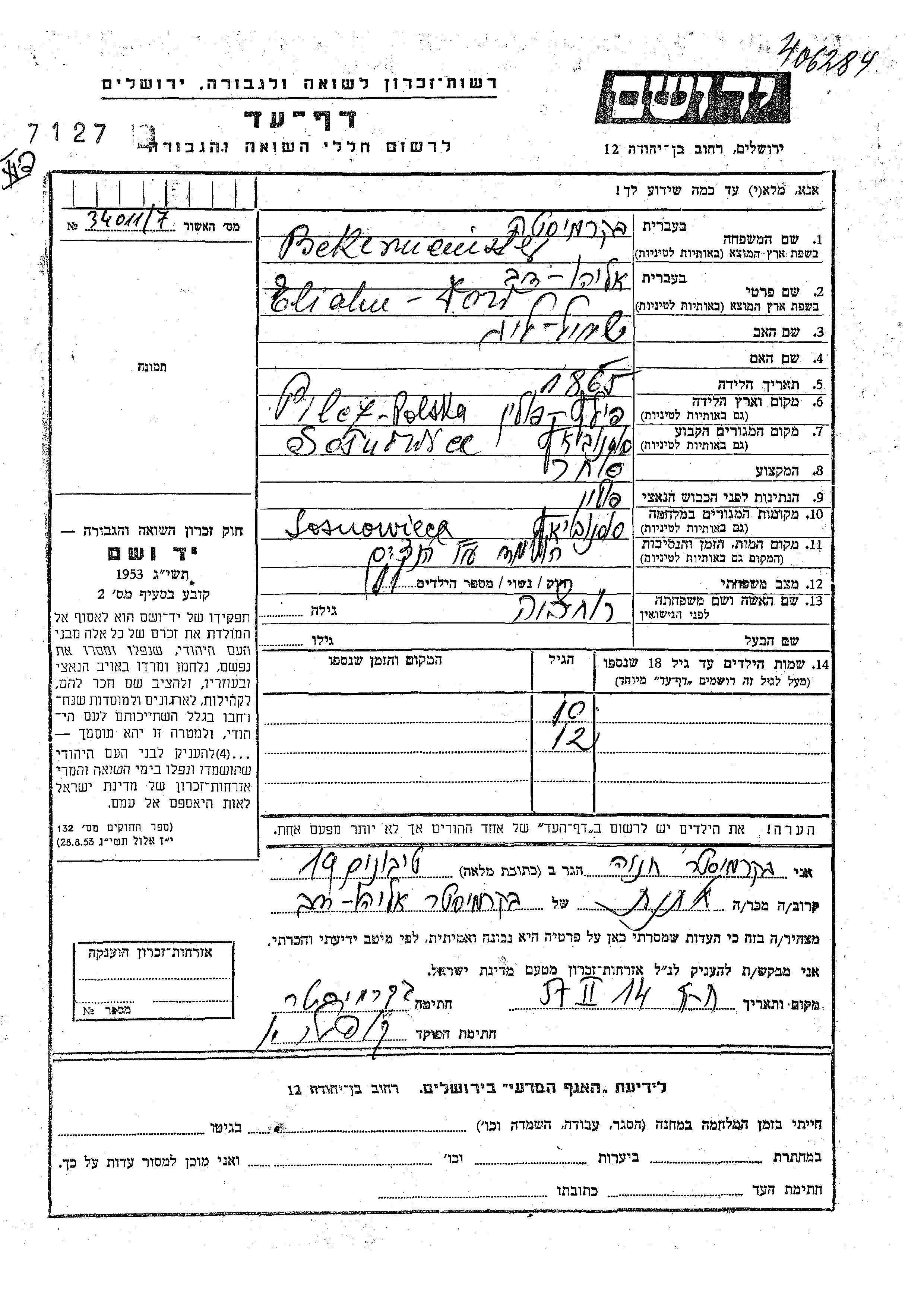 Vorname unbekannt Bekermeister wurde Er/sie war der/ die Sohn/Tochter von Eliahu Dov und Rakhel. Er/Sie war Kind. Vor dem Zweiten Weltkrieg er/sie in Sosnowic, Polen. Während des Krieges war er/sie in Sosnowic, Polen.