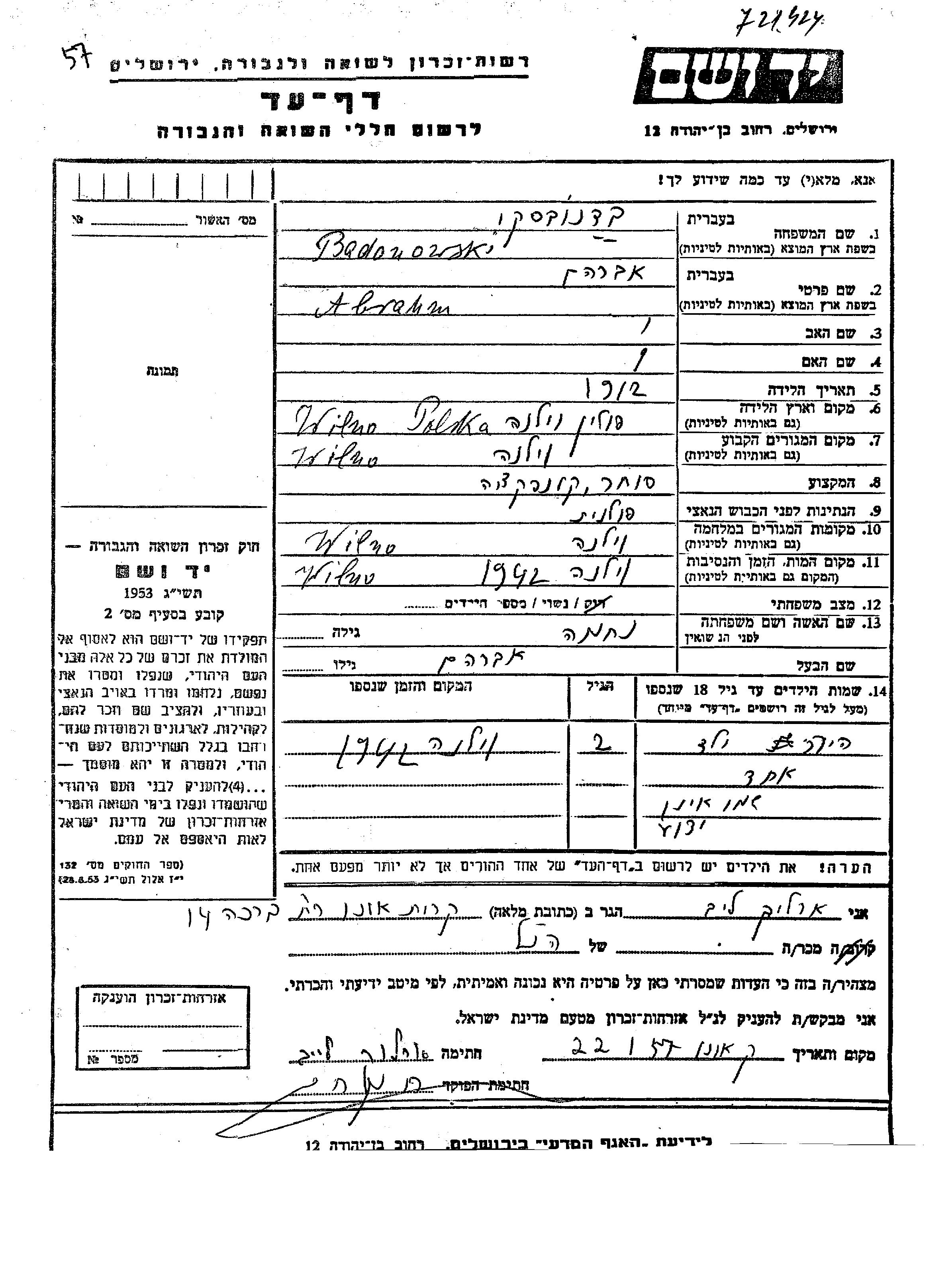 Vorname unbekannt Badanowski wurde Er/sie war der/ die Sohn/Tochter von Abrahm und Nekhama. Er/Sie war Kind. Vor dem Zweiten Weltkrieg er/sie in Wilno, Polen. Während des Krieges war er/sie in Wilno, Polen.