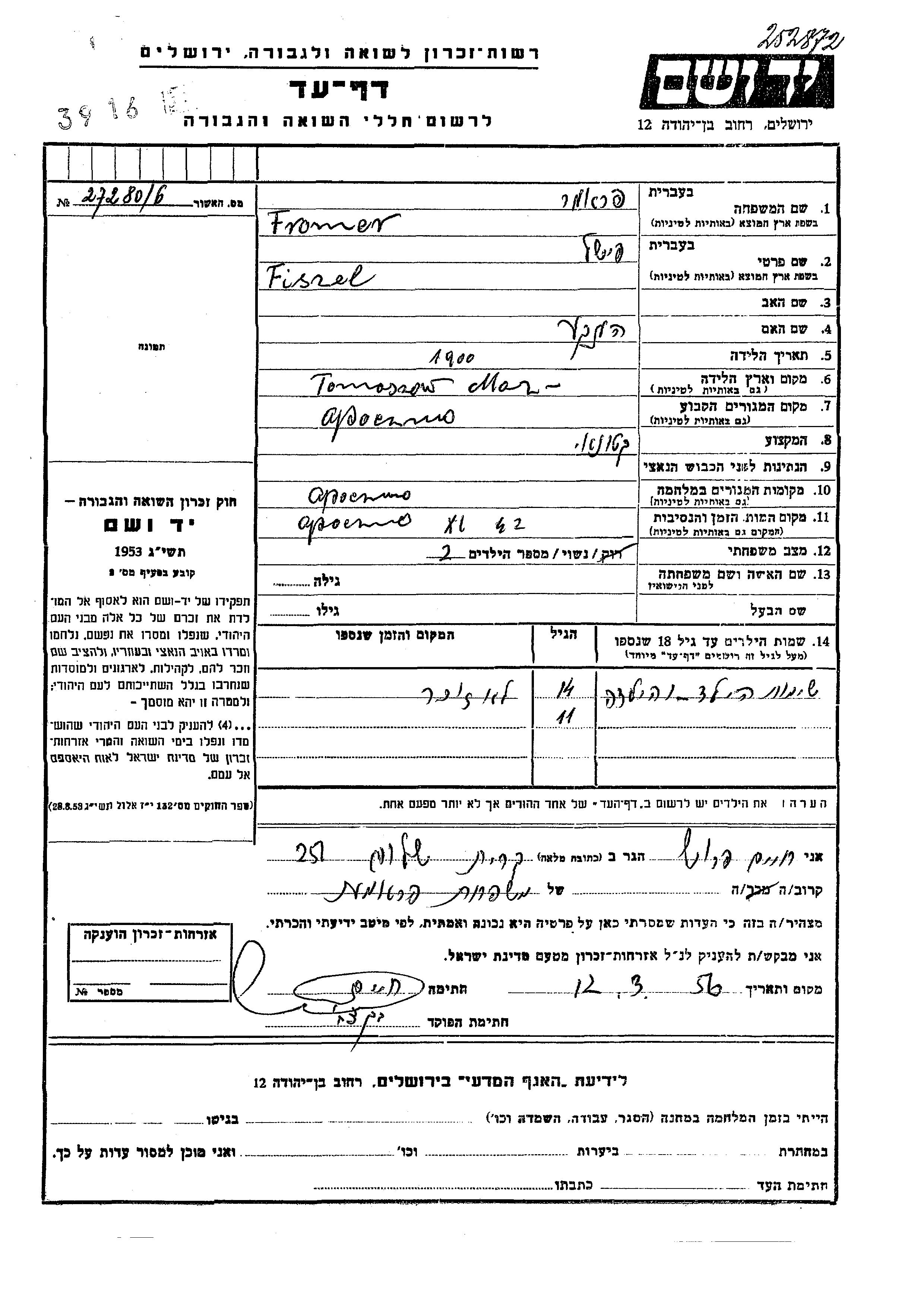 Vorname unbekannt Fromer wurde Er/sie war der/ die Sohn/Tochter von Fiszel. Er/Sie war Kind. Vor dem Zweiten Weltkrieg er/sie in Opoczno, Polen. Während des Krieges war er/sie in Opoczno, Polen.
