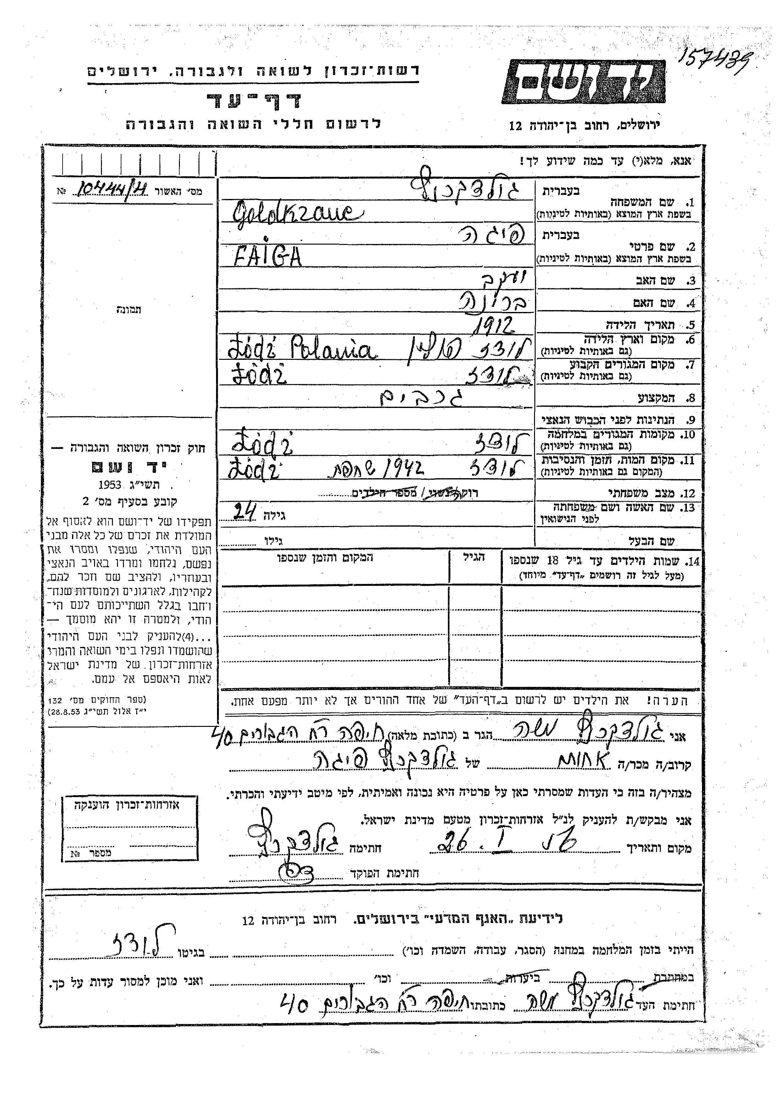 Faiga wurde in der Schoah ermordet. Todesort: Lodz, Polen im Jahr 1942.