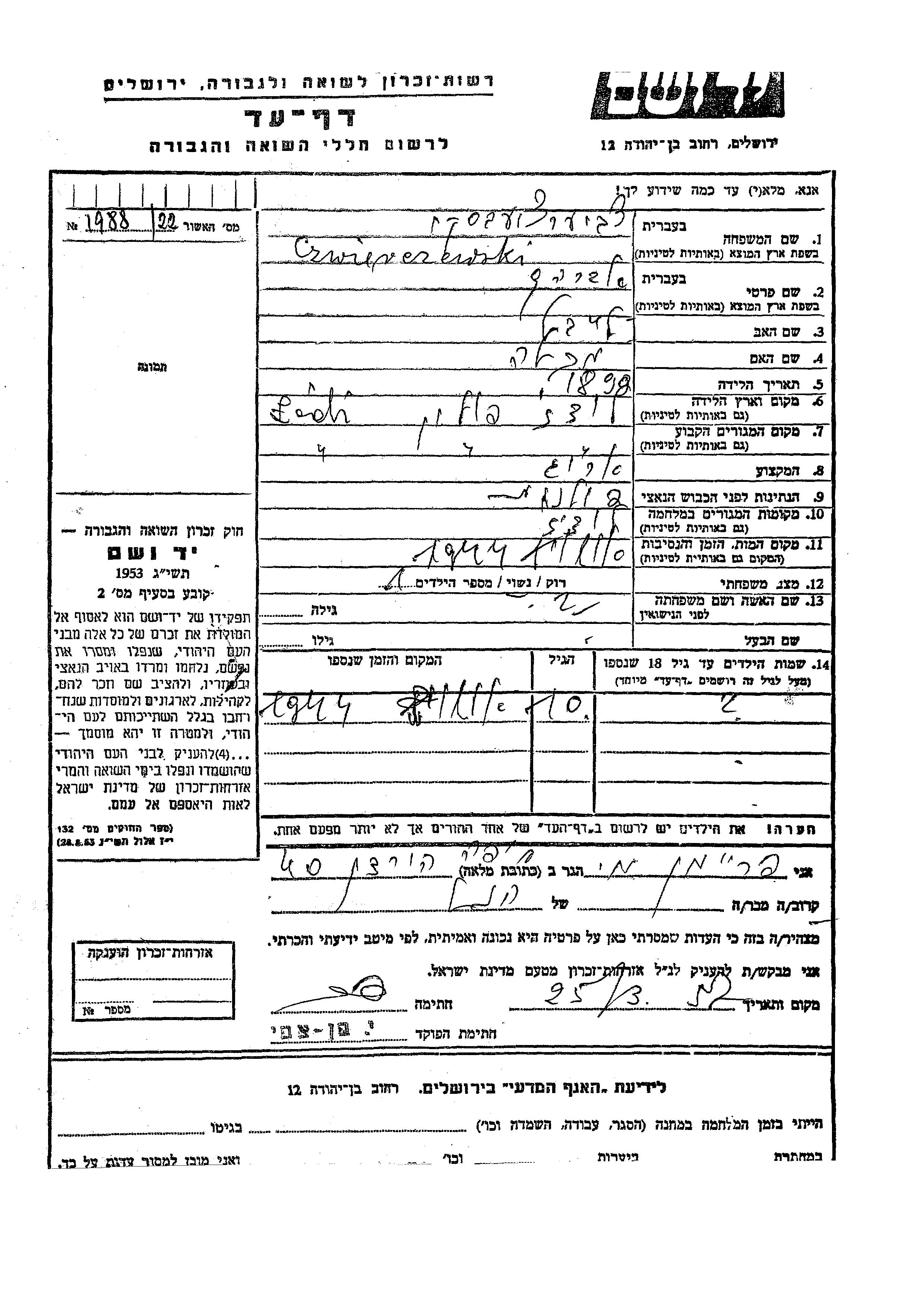 Vorname unbekannt Czwierczewski wurde Er/sie war der/ die Sohn/Tochter von Avraham. Er/Sie war Kind. Vor dem Zweiten Weltkrieg er/sie in Lodz, Polen. Während des Krieges war er/sie in Lodz, Polen.