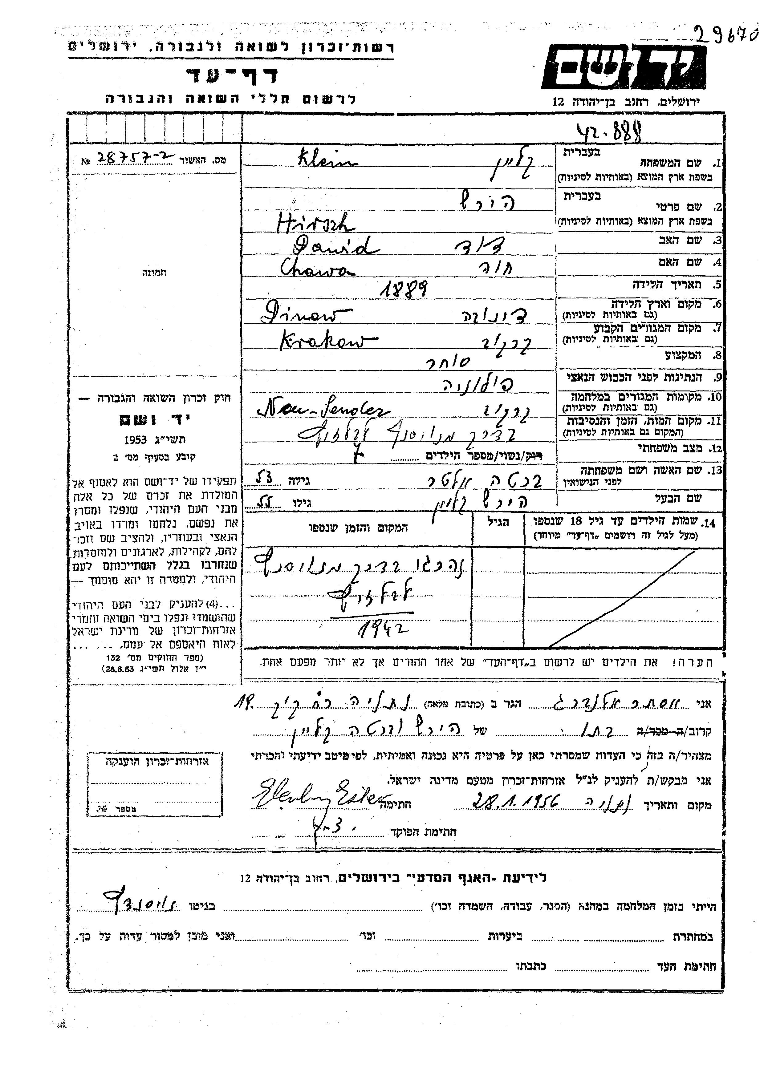 Hirsch Klein wurde im Jahr 1889 in Dinow, Polen geboren. Er war der Sohn von Dawid und Chawa. Er war Kaufmann/-frau und mit Berta, geb. Volter Verheiratet. Vor dem Zweiten Weltkrieg lebte er in Krakow, Polen. Während des Krieges war er in Krakow, Polen.