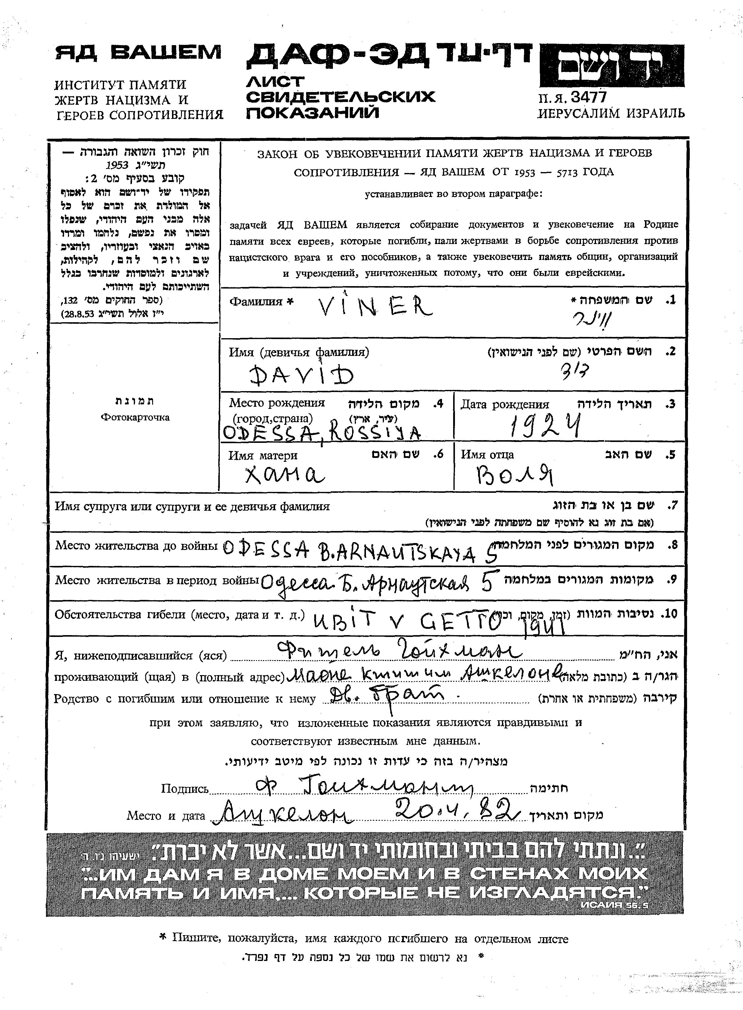 David Viner wurde im Jahr 1924 in Odessa, Ukraine (UdSSR) geboren. Er war der Sohn von Volya und Khana. Vor dem Zweiten Weltkrieg lebte er in Odessa, Ukraine (UdSSR). Während des Krieges war er in Odessa, Ukraine (UdSSR).