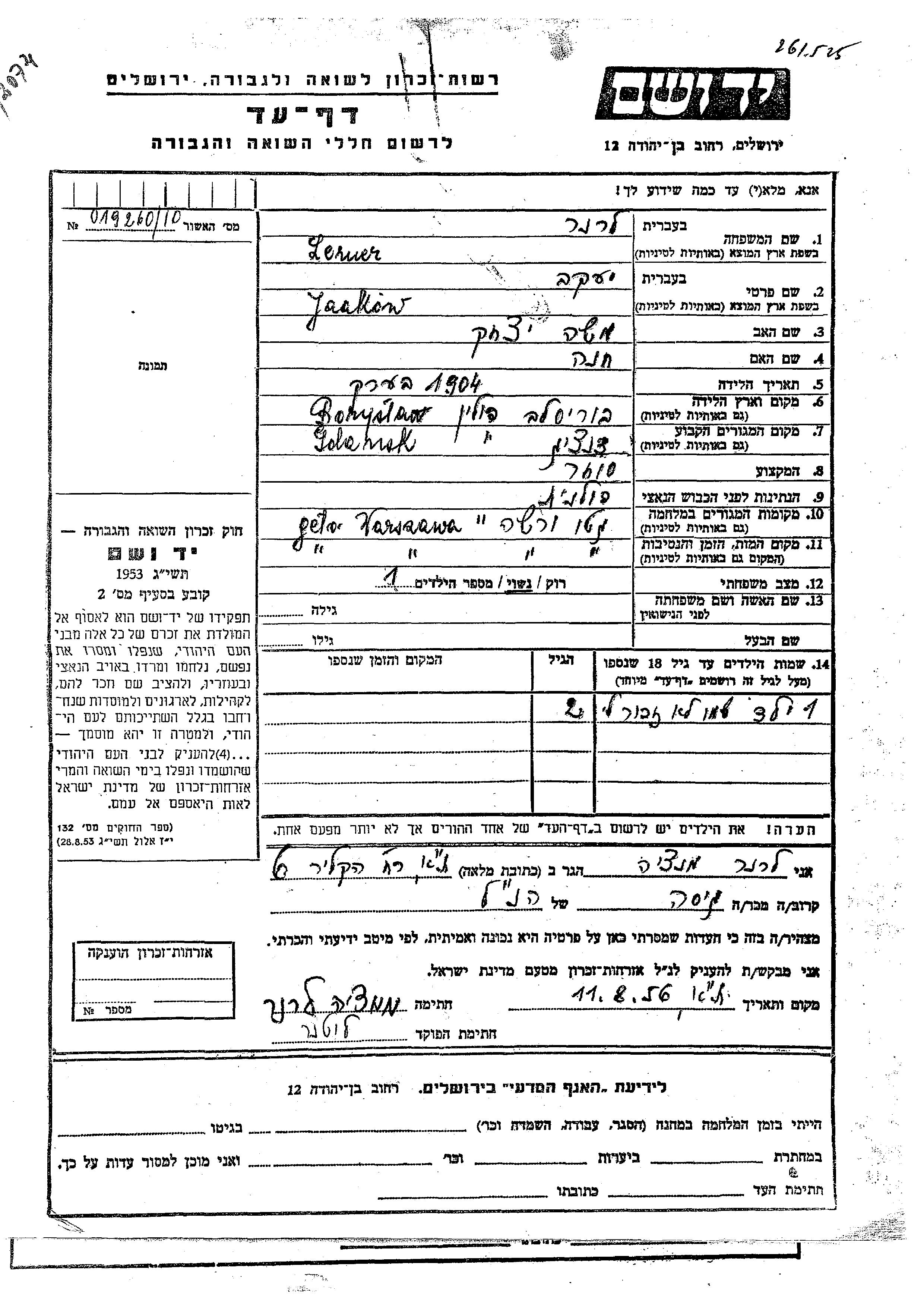 Vorname unbekannt Lerner wurde Er/sie war der/ die Sohn/Tochter von Jaakow. Er/Sie war Kind. Vor dem Zweiten Weltkrieg er/sie in Danzig, Freie Stadt Danzig. Während des Krieges war er/sie in Warsaw, Polen.