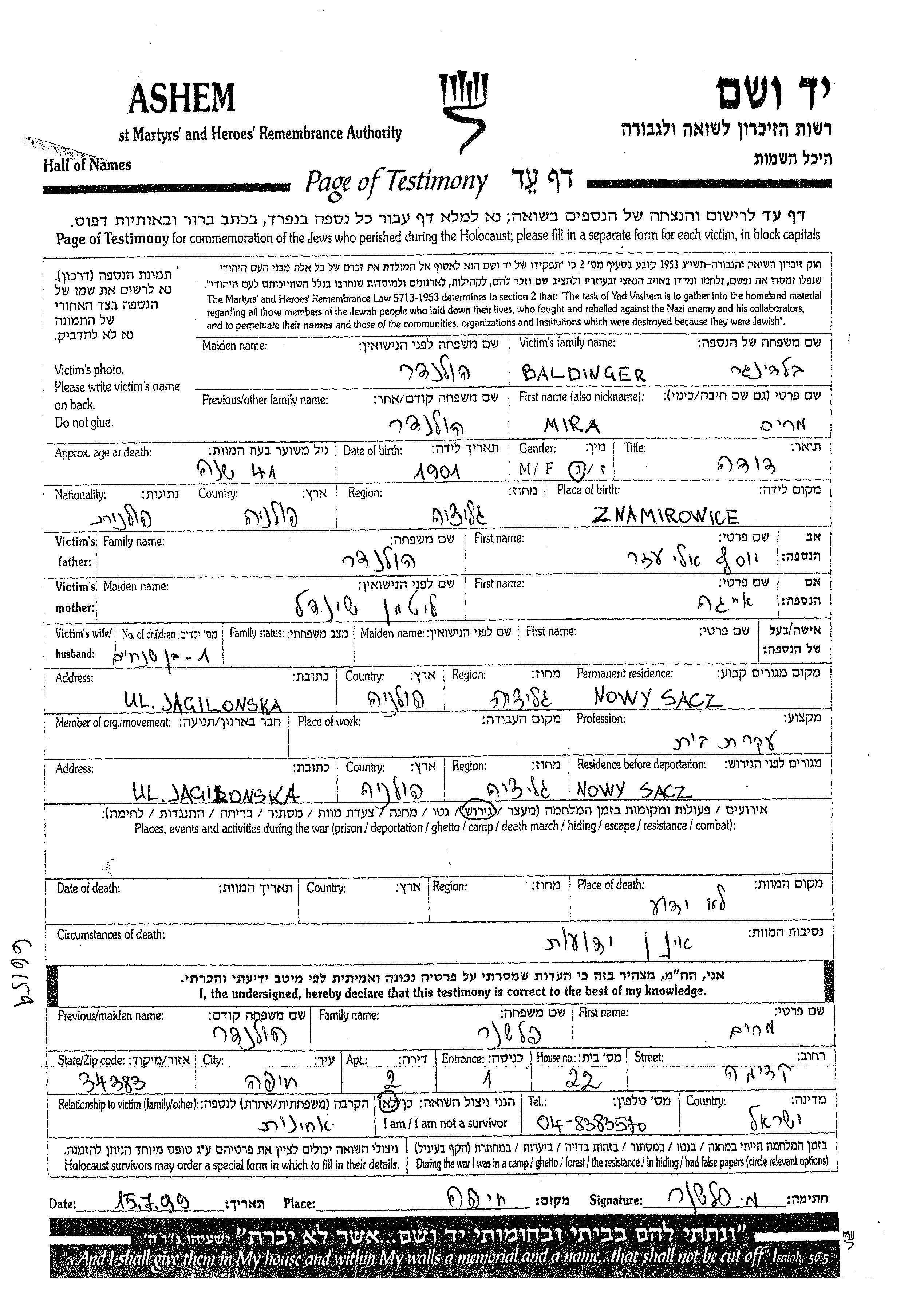 Vorname unbekannt Baldinger wurde Er/sie war der/ die Sohn/Tochter von Mira Miriam, geb. Holander. Er/Sie war Kind. Vor dem Zweiten Weltkrieg er/sie in Nowy Sacz, Polen. Während des Krieges war er/sie in Nowy Sacz, Polen.