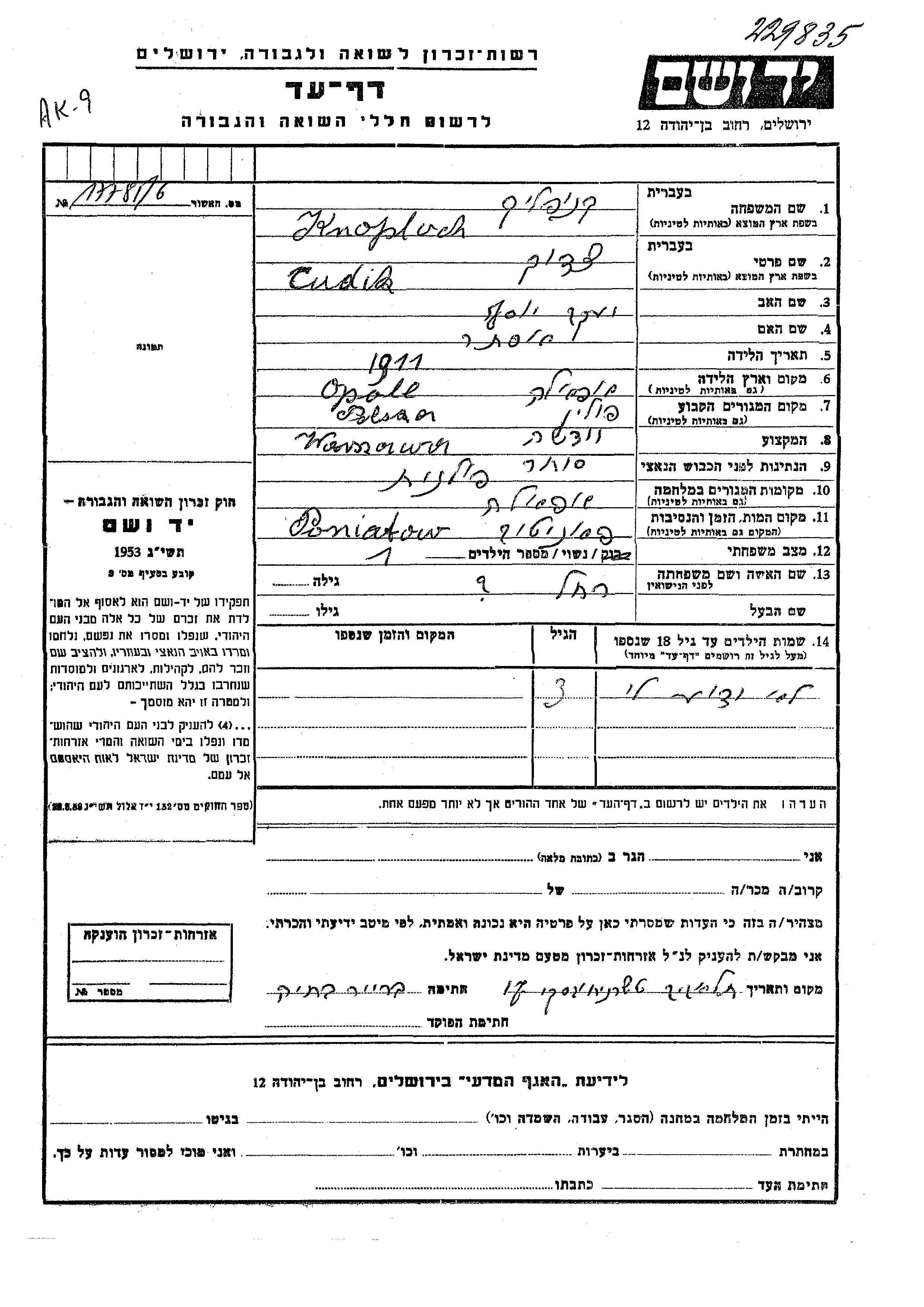 Vorname unbekannt Knoploch wurde Er/sie war der/ die Sohn/Tochter von Cudik und Rakhel. Er/Sie war Kind. Vor dem Zweiten Weltkrieg er/sie in Warszawa, Polen. Während des Krieges war er/sie in Opole, Polen.