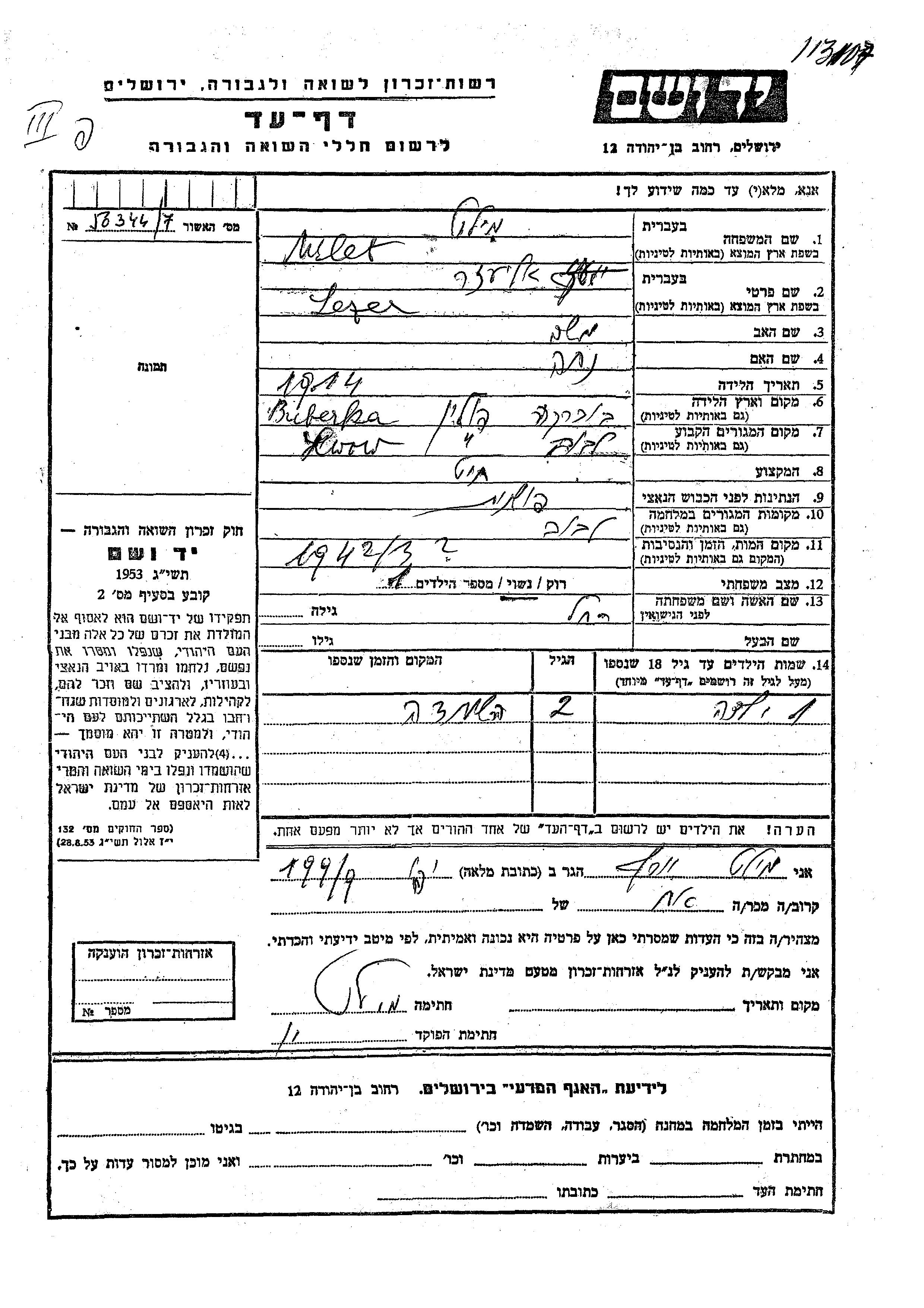 Vorname unbekannt Milet wurde Er/sie war der/ die Sohn/Tochter von Lezer und Rakhel. Er/Sie war Kind. Vor dem Zweiten Weltkrieg er/sie in Lwow, Polen. Während des Krieges war er/sie in Lwow, Polen.