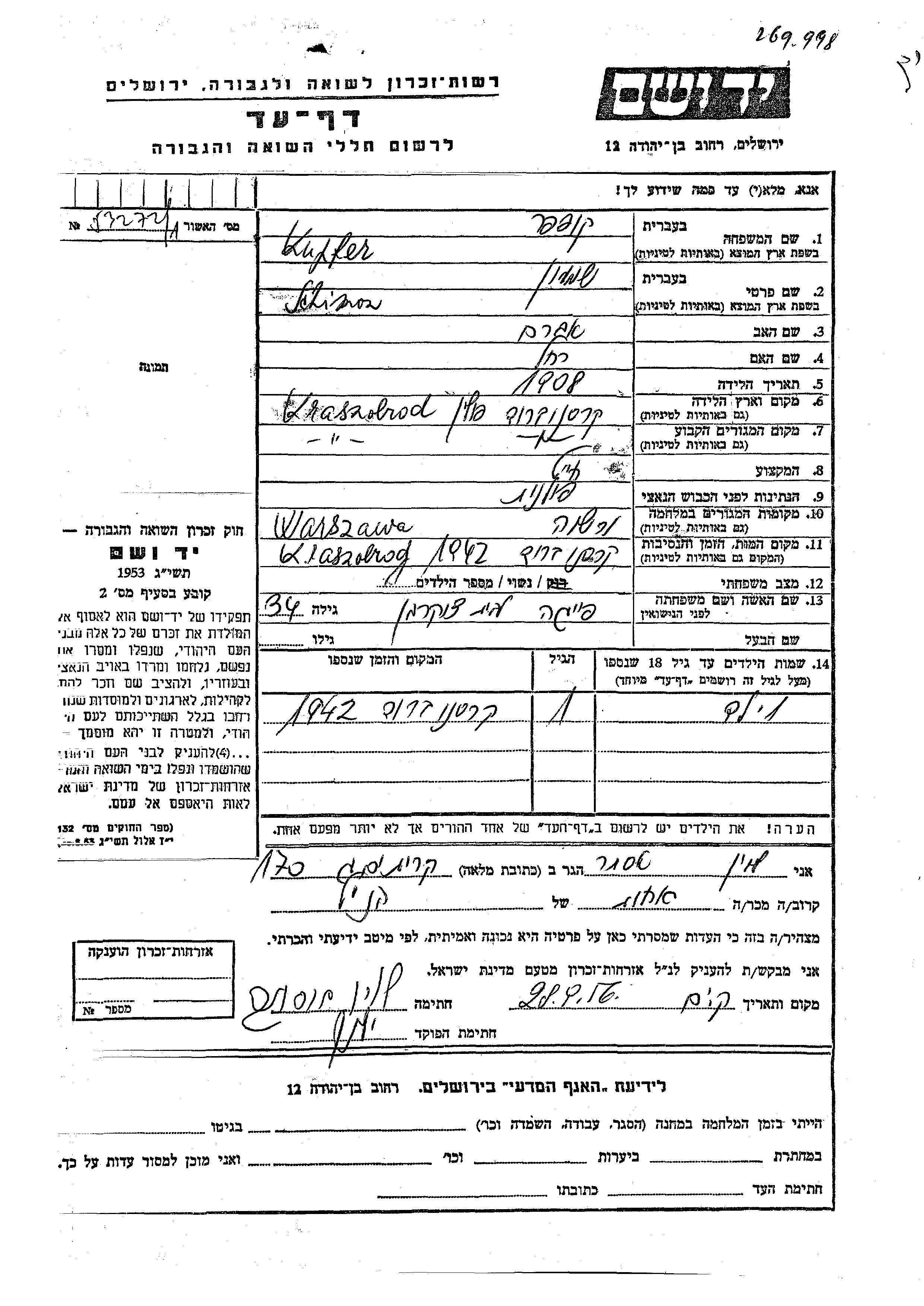 Vorname unbekannt Kupfer wurde Er/sie war der/ die Sohn/Tochter von Shimon und Feiga, geb. Tzukerman. Er/Sie war Kind. Vor dem Zweiten Weltkrieg er/sie in Krasnobrod, Polen. Während des Krieges war er/sie in Warsaw, Polen.