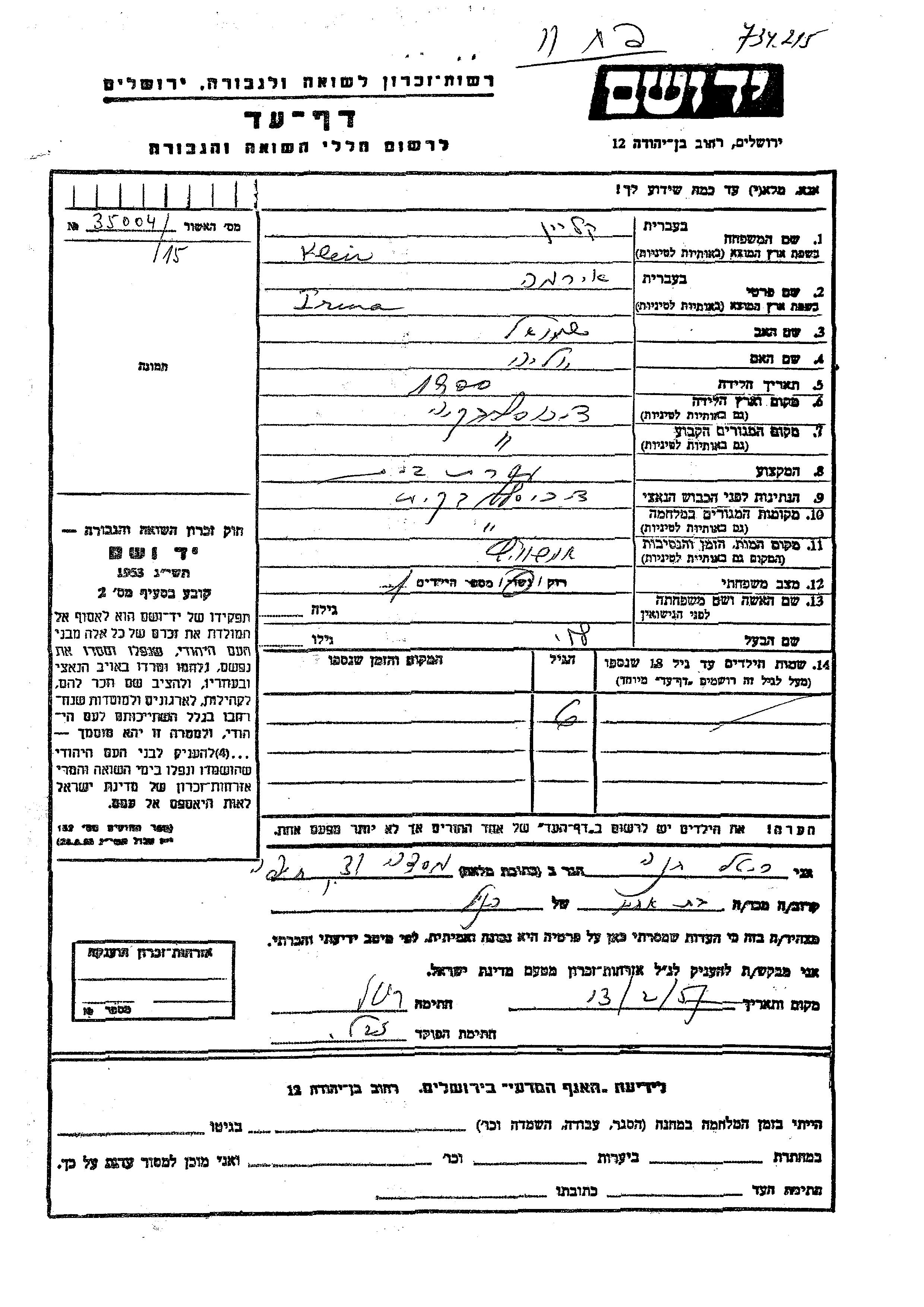 Vorname unbekannt Klein wurde Er/sie war der/ die Sohn/Tochter von Levi und Irma. Er/Sie war Kind. Vor dem Zweiten Weltkrieg er/sie in Tschechoslowakei. Während des Krieges war er/sie in Tschechoslowakei.