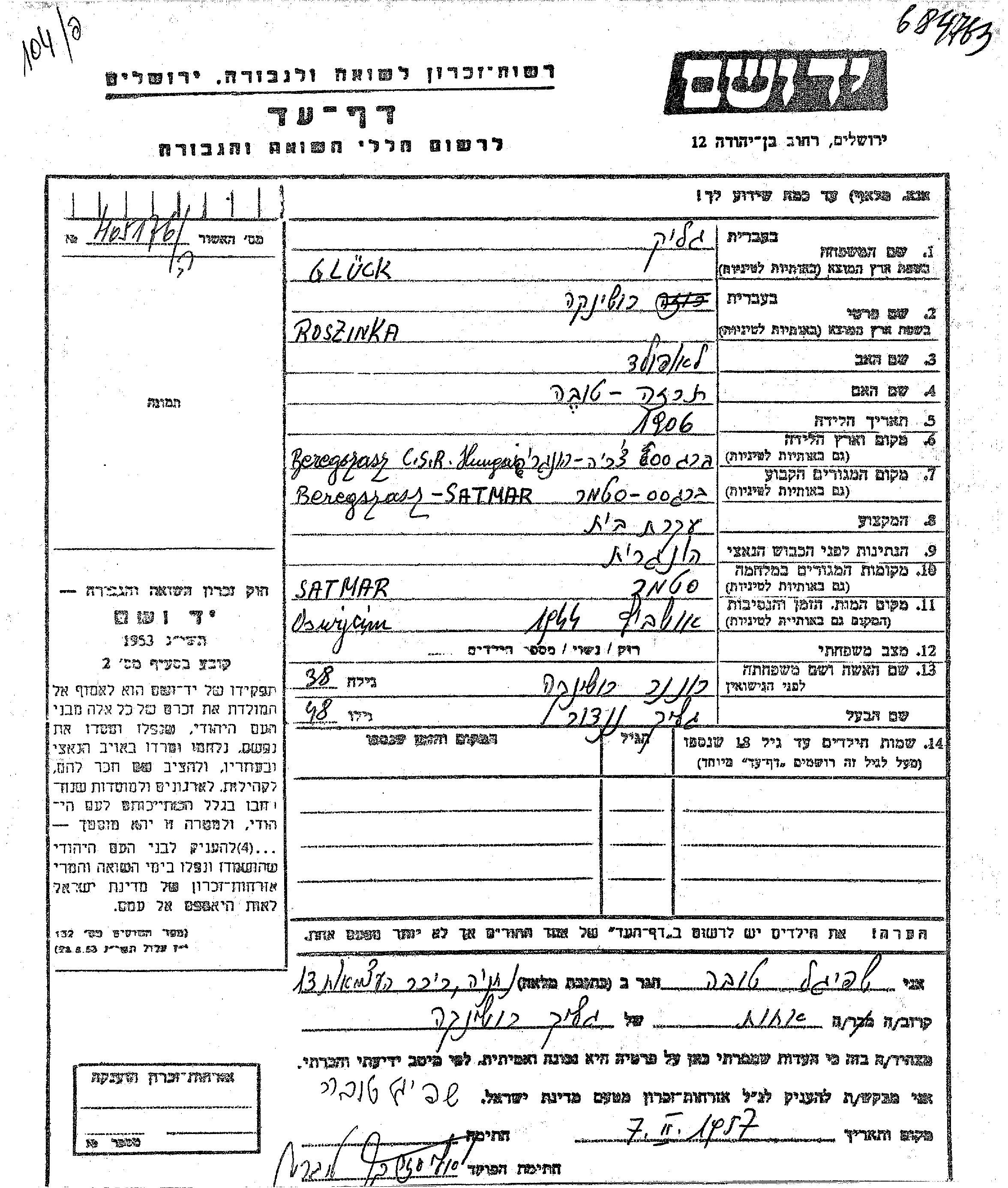 Roszinka Glück, geb. Roner wurde im Jahr 1906 in Beregszasz, Tschechoslowakei geboren. Sie war die Tochter von Leopold und Tereza Tova. Sie war Hausfrau und mit Nandor Verheiratet. Vor dem Zweiten Weltkrieg lebte sie in Beregszasz, Tschechoslowakei. Während des Krieges war sie in Satmar, Rumänien.