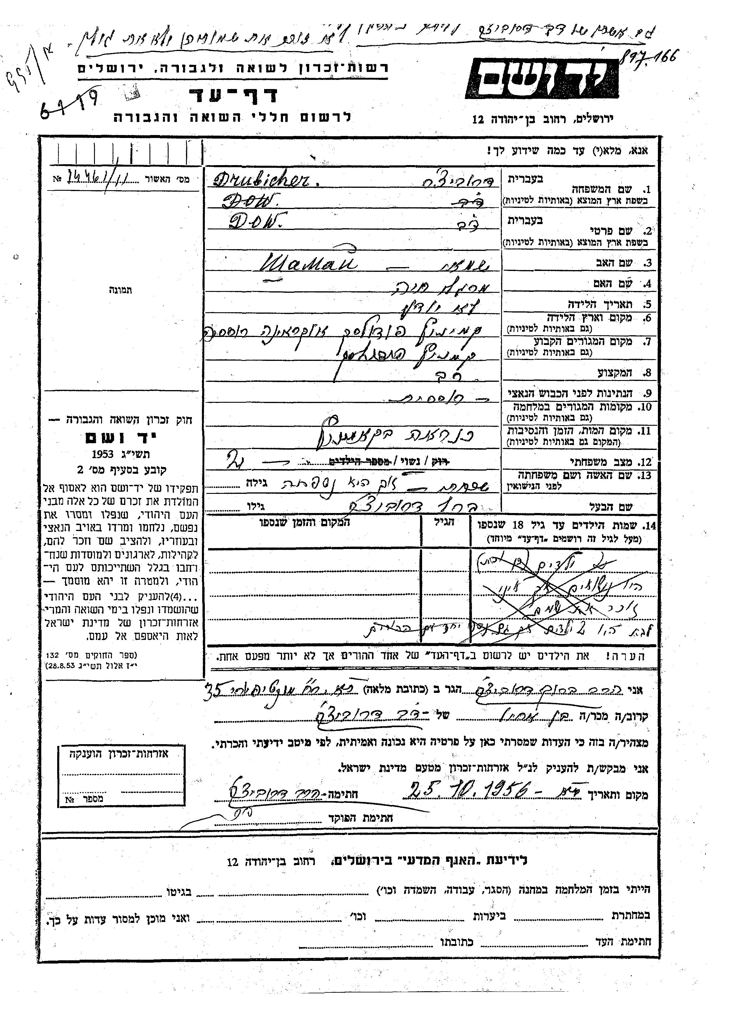 Dow Drubicher wurde in Kamenets Podolskiy, Ukraine (UdSSR) geboren. Er war der Sohn von Shamai und Margolit Khaia. Er war Rabbiner und mit Ester Verheiratet. Vor dem Zweiten Weltkrieg lebte er in Kamenets Podolskiy, Ukraine (UdSSR).