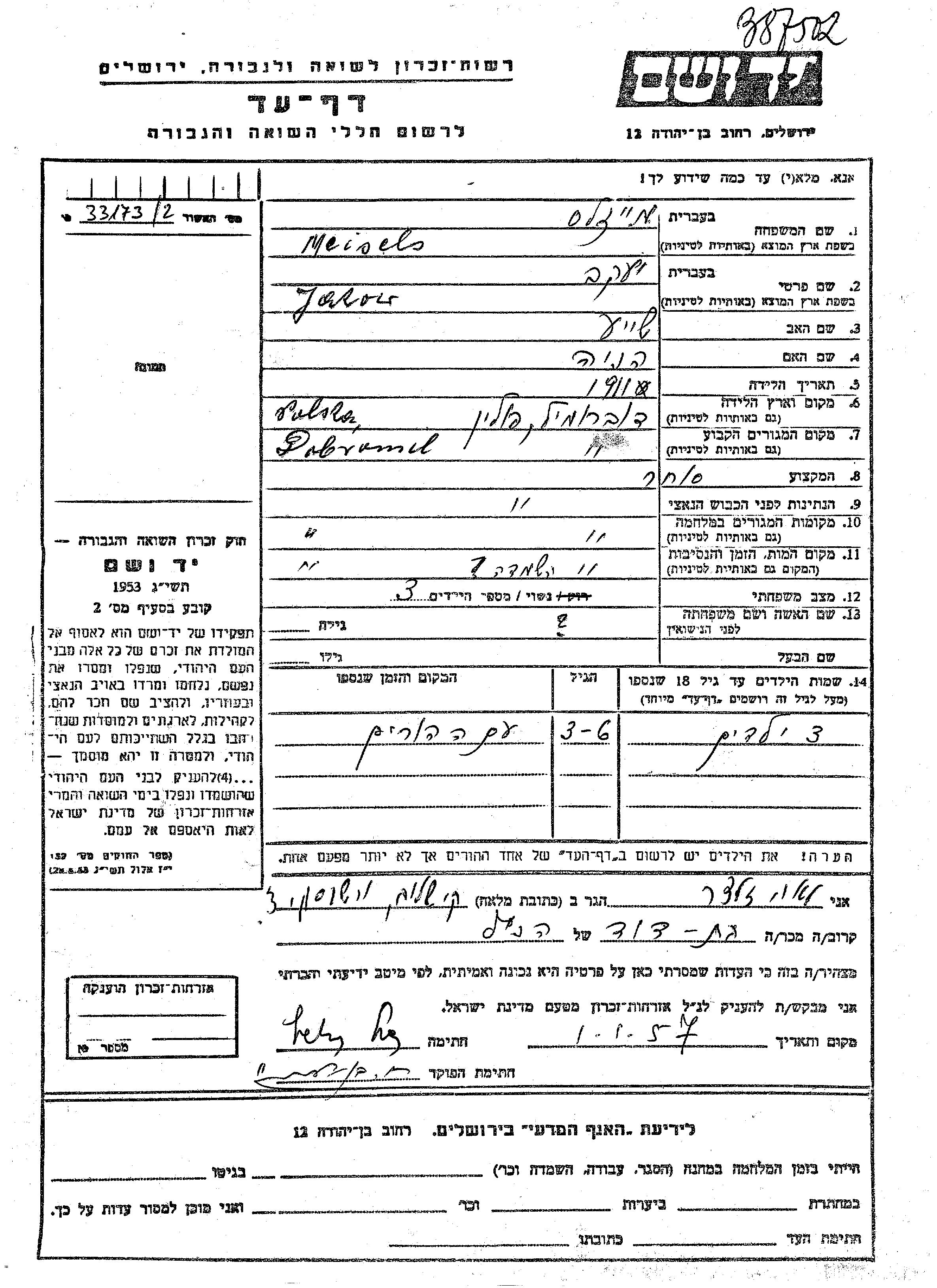 Vorname unbekannt Meisels wurde Er/sie war der/ die Sohn/Tochter von Yakow. Er/Sie war Kind. Vor dem Zweiten Weltkrieg er/sie in Dobromil, Polen. Während des Krieges war er/sie in Dobromil, Polen.