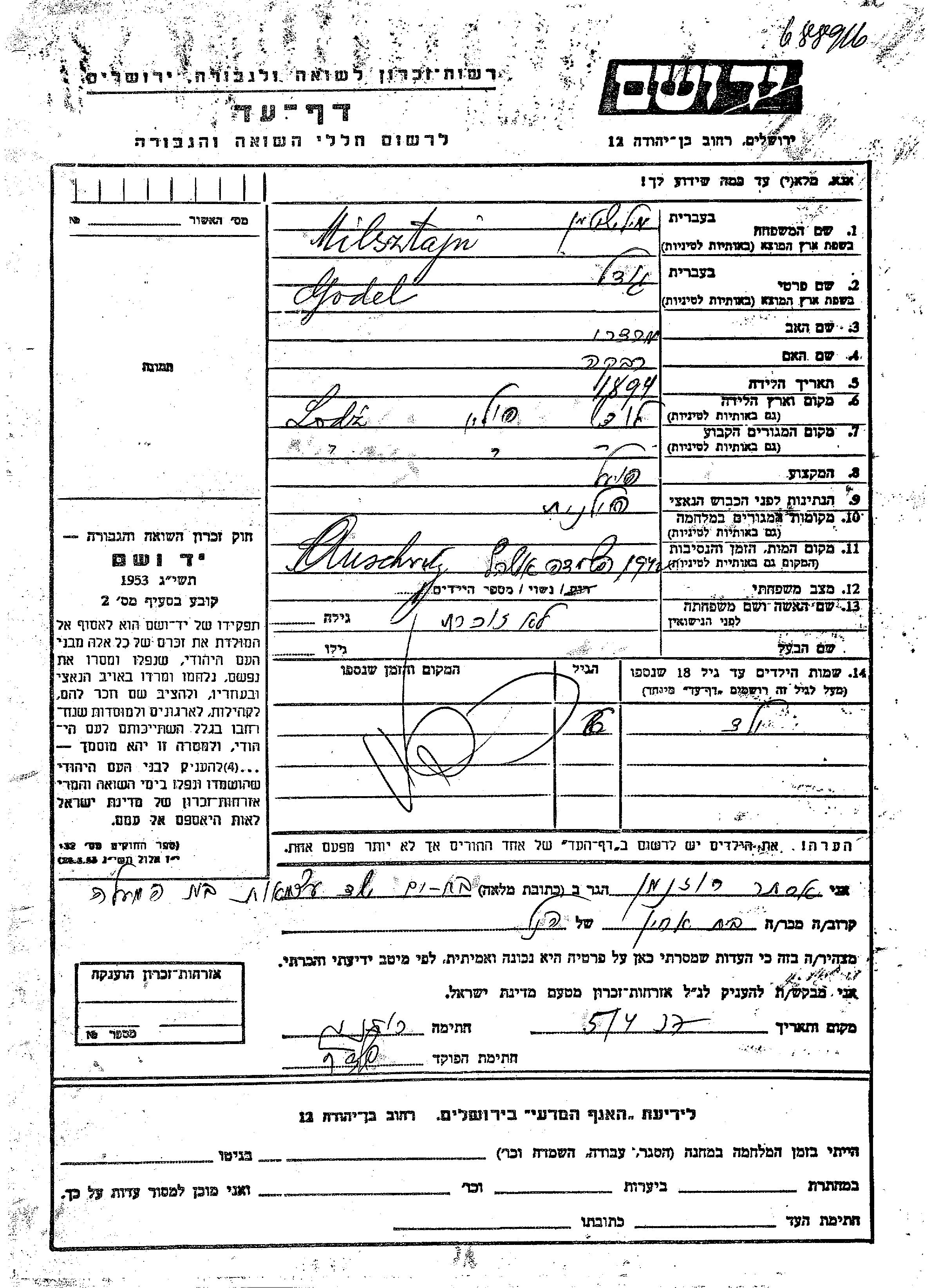 Milsztajn Vorname unbekannt Lodz, Polen Gedenkblatt