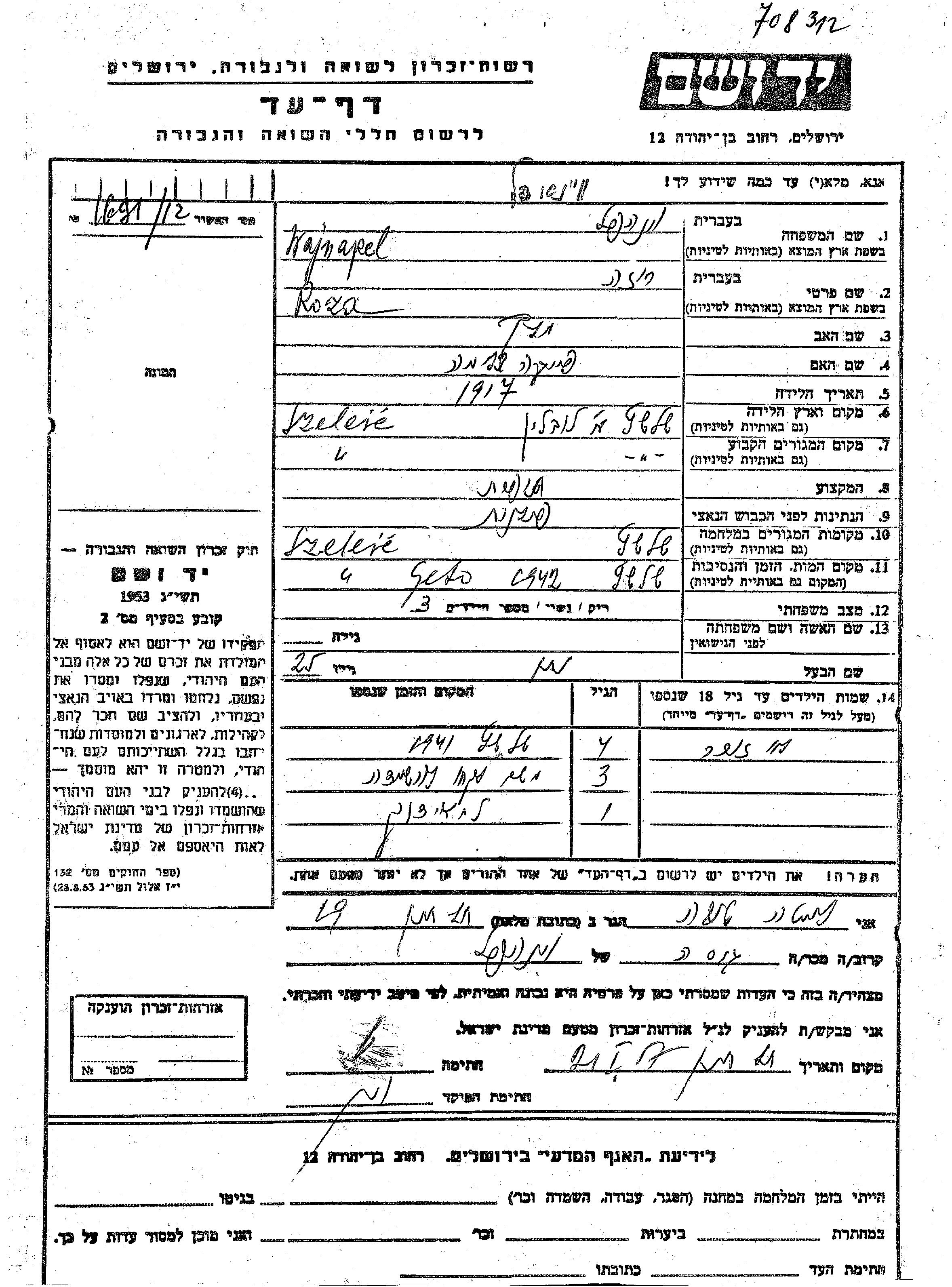 Vorname unbekannt Wajnapel wurde Er/sie war der/ die Sohn/Tochter von Natan und Roza. Er/Sie war Kind. Vor dem Zweiten Weltkrieg er/sie in Szeleszcz, Polen. Während des Krieges war er/sie in Szeleszcz, Polen.