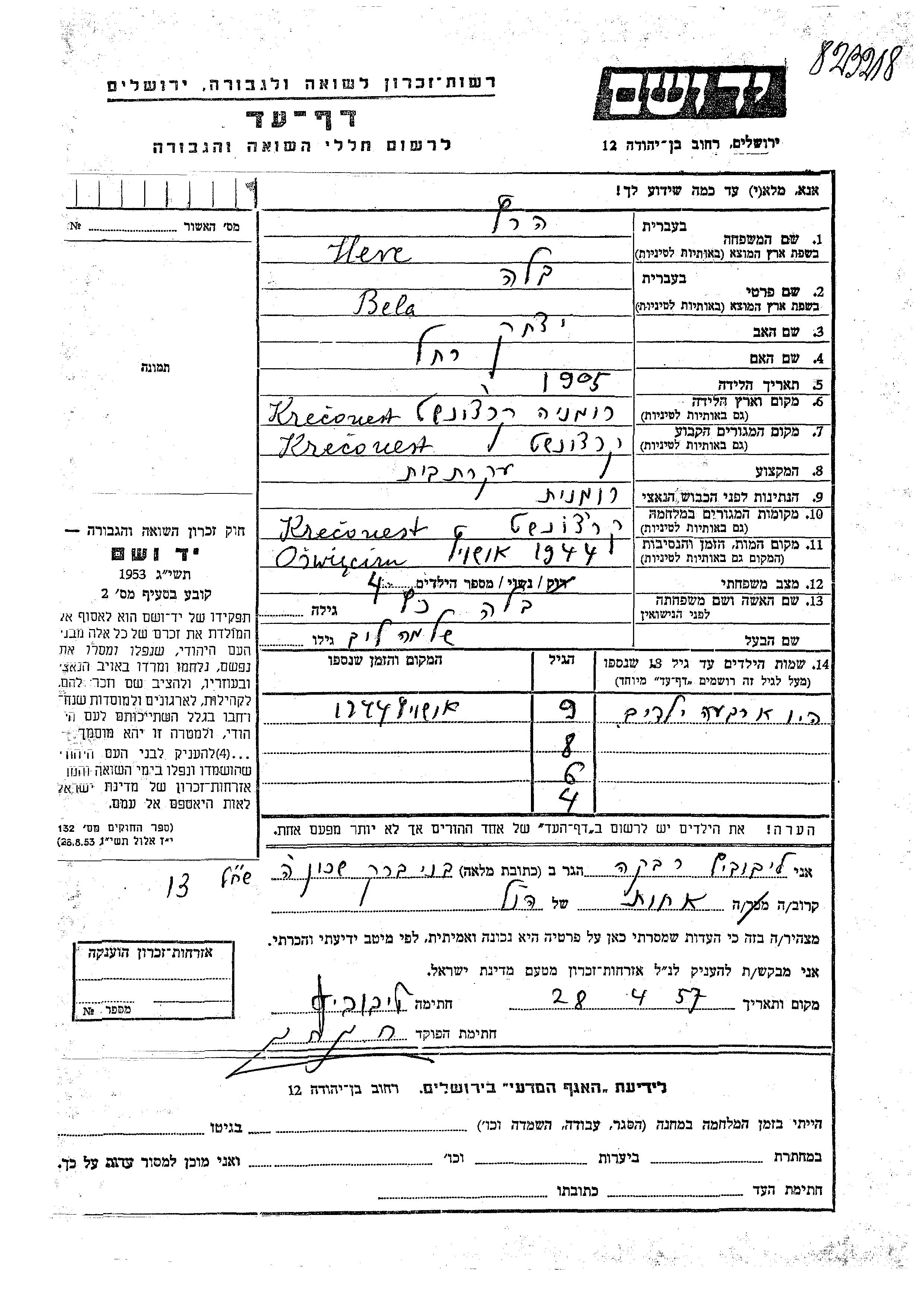 Vorname unbekannt Herc wurde Er/sie war der/ die Sohn/Tochter von Shlomo Leib und Bela, geb. Katz. Er/Sie war Kind. Vor dem Zweiten Weltkrieg er/sie in Kreconest, Rumänien. Während des Krieges war er/sie in Kreconest, Rumänien.