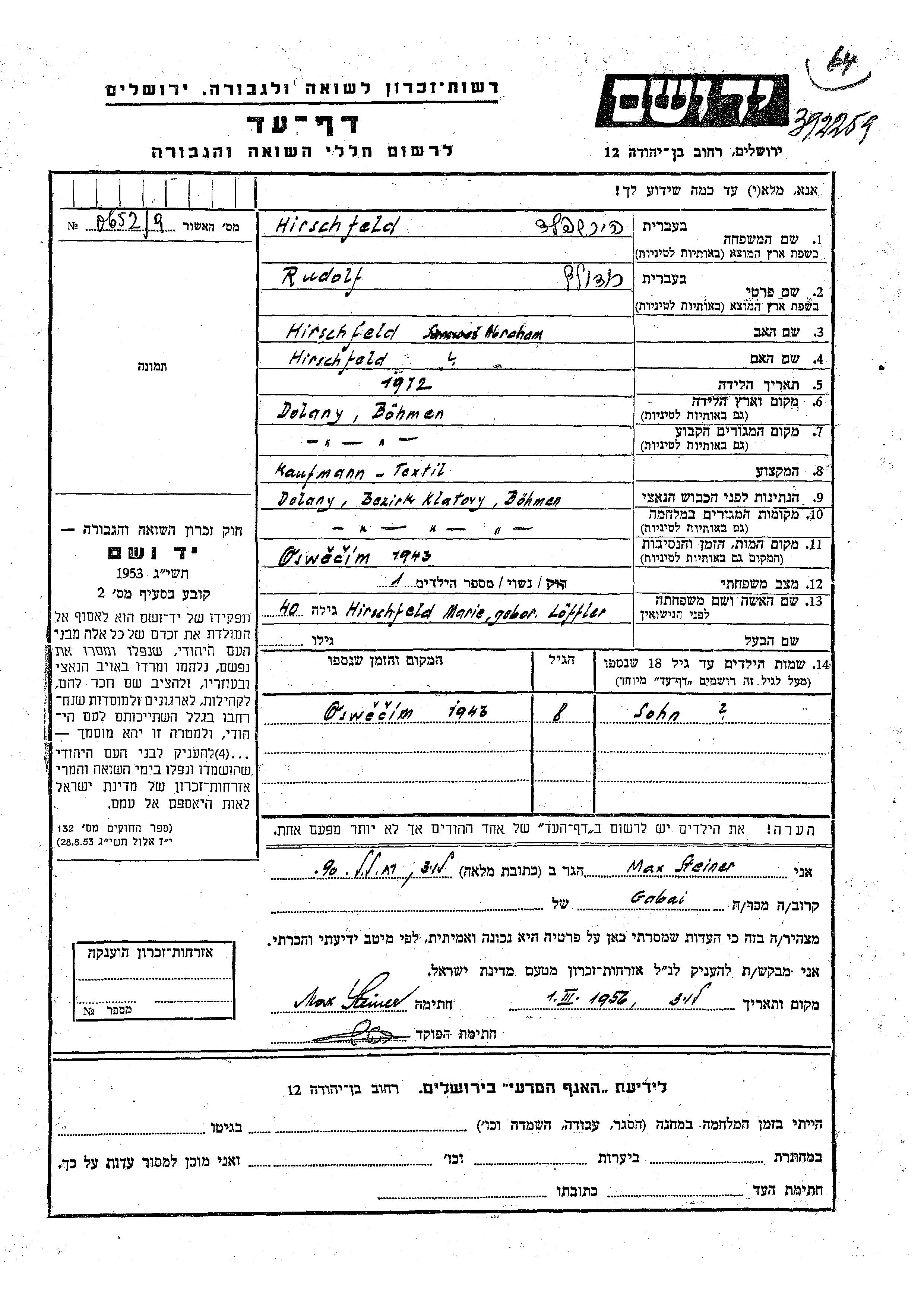 Hirshfeld Vorname unbekannt Dolany, Tschechoslowakei Gedenkblatt