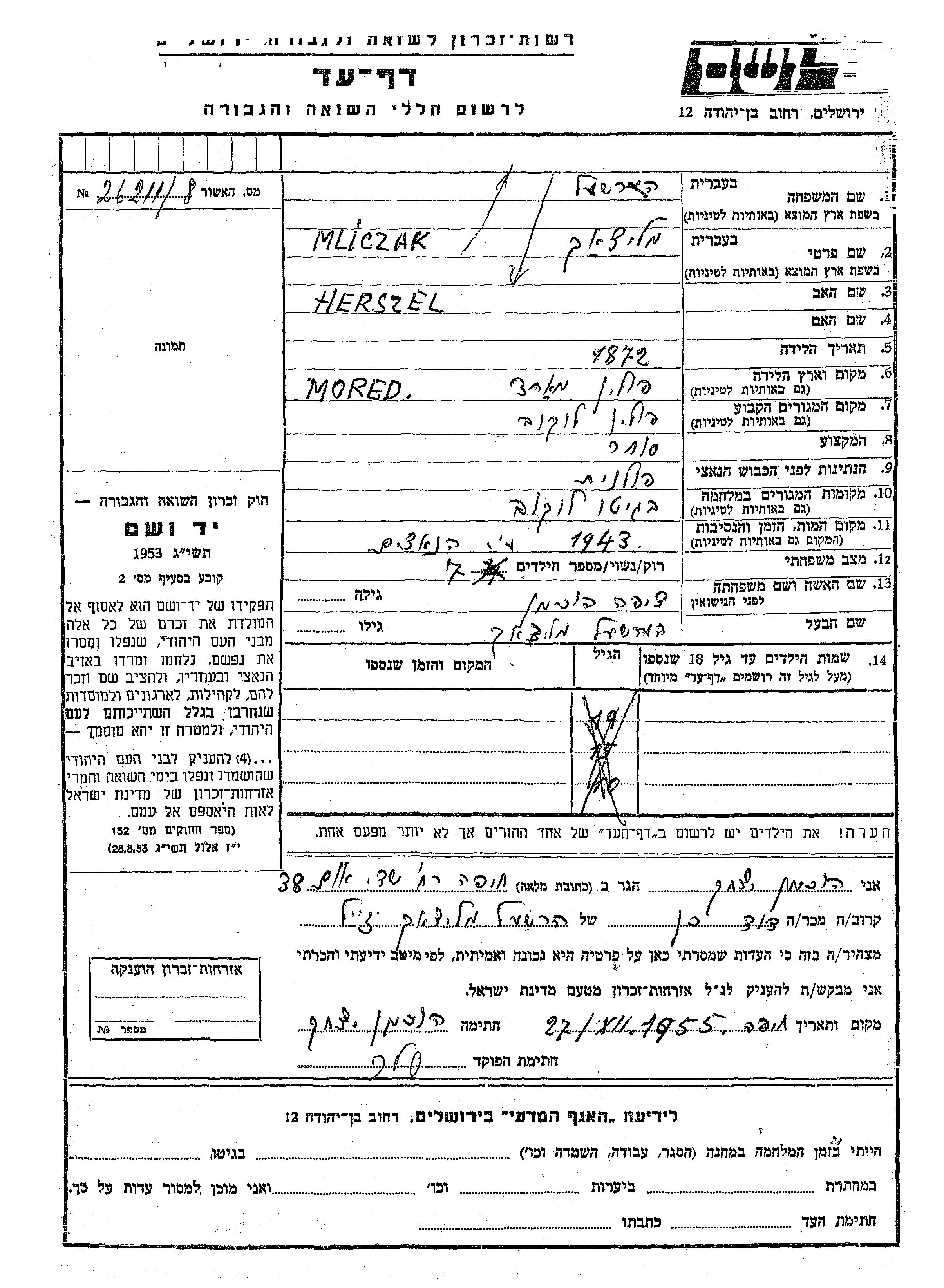 Vorname unbekannt Mliczak wurde Er/sie war der/ die Sohn/Tochter von Herszel und Yafa, geb. Hokhman. Vor dem Zweiten Weltkrieg er/sie in Lukow, Polen. Während des Krieges war er/sie in Lukow, Polen.