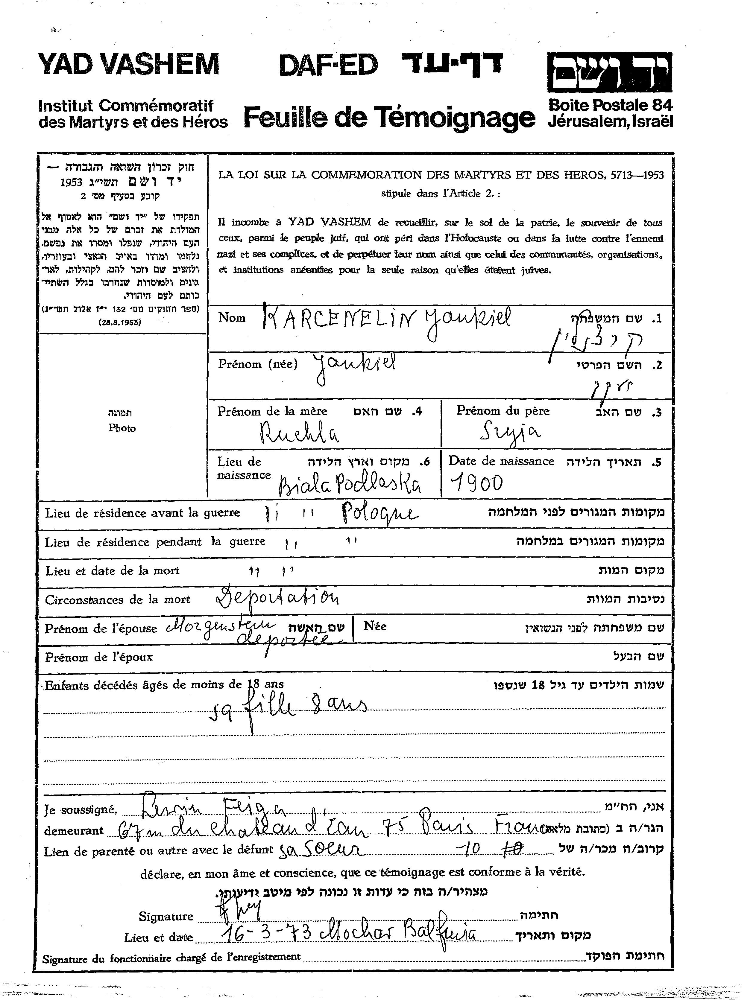 Vorname unbekannt Karcenelin wurde Er/sie war der/ die Sohn/Tochter von Yankiel, geb. Morgenstein. Er/Sie war Kind. Vor dem Zweiten Weltkrieg er/sie in Biala Podlaska, Polen. Während des Krieges war er/sie in Biala Podlaska, Polen.