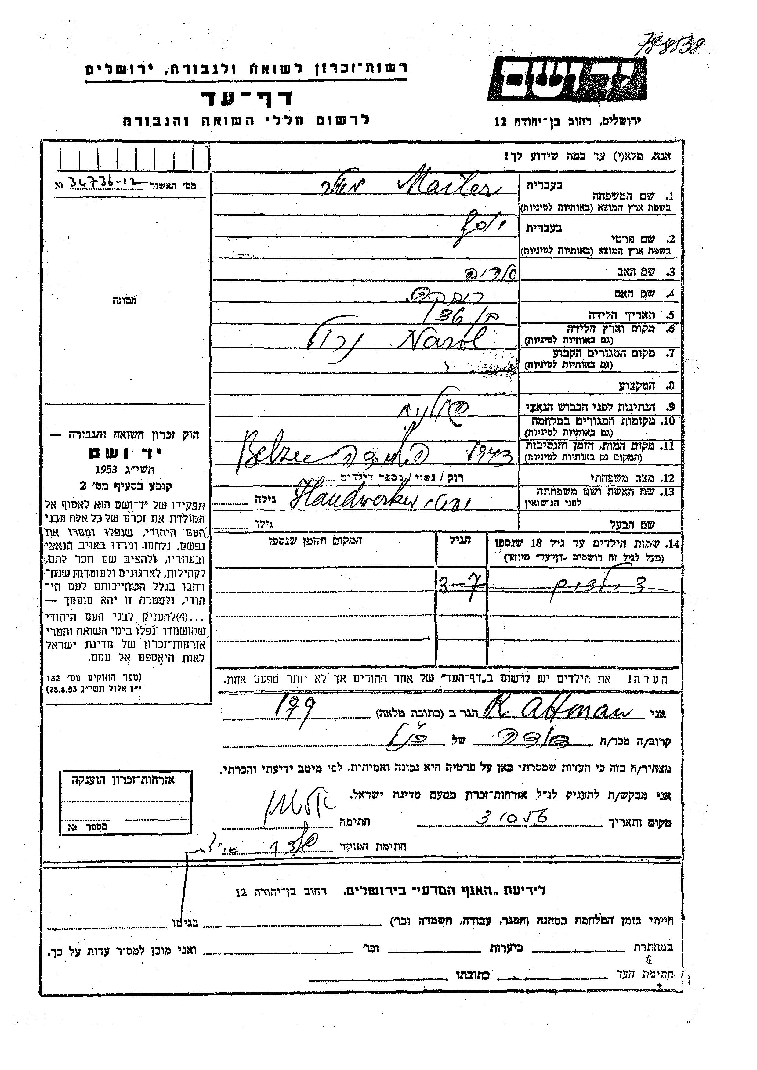 Vorname unbekannt Mailer wurde Er/sie war der/ die Sohn/Tochter von Yosef und Yeti, geb. Handwerker. Er/Sie war Kind. Vor dem Zweiten Weltkrieg er/sie in Narol, Polen.