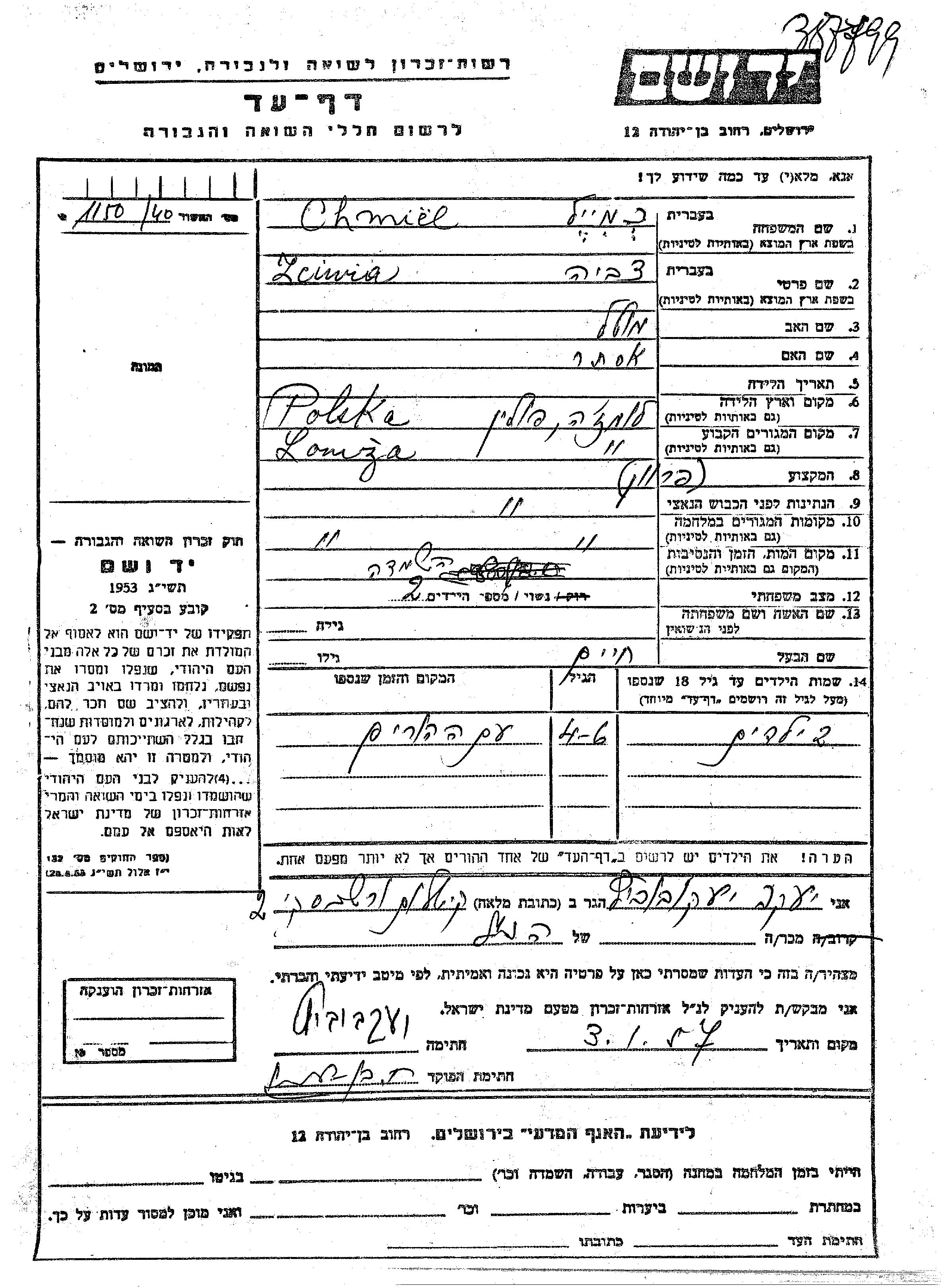 Vorname unbekannt Chmiel wurde Er/sie war der/ die Sohn/Tochter von Khaim und Zciwia. Er/Sie war Kind. Vor dem Zweiten Weltkrieg er/sie in Łomża, Polen. Während des Krieges war er/sie in Łomża, Polen.