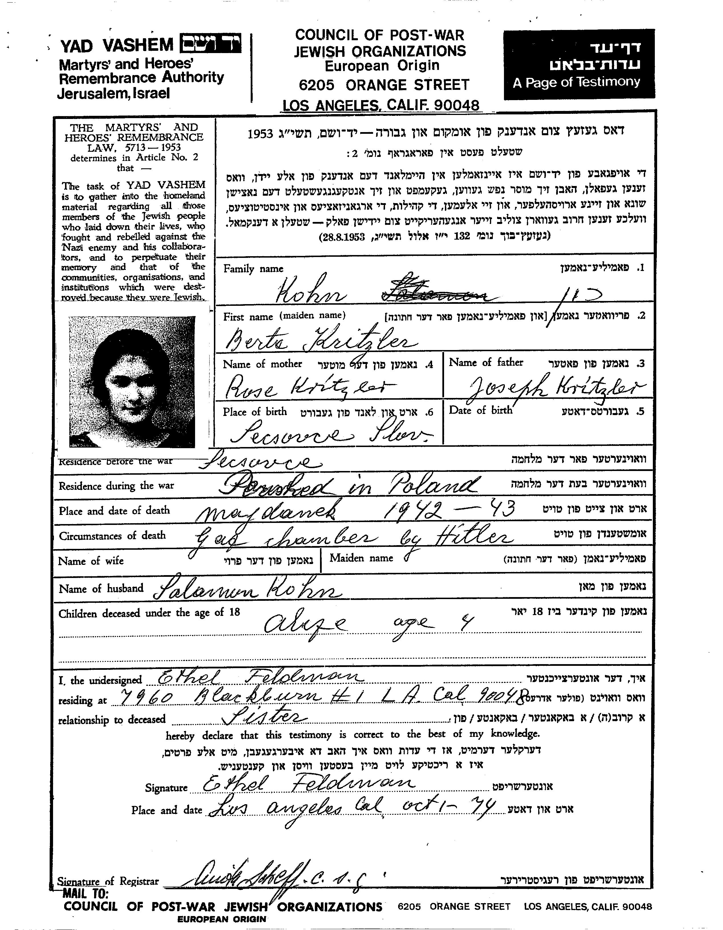 Undeciphered First Name Kohn Kon wurde Er/sie war der/ die Sohn/Tochter von Salamon und Berta, geb. Kritzler. Er/Sie war Kind. Vor dem Zweiten Weltkrieg er/sie in Lwow, Polen. Während des Krieges war er/sie in Polen.