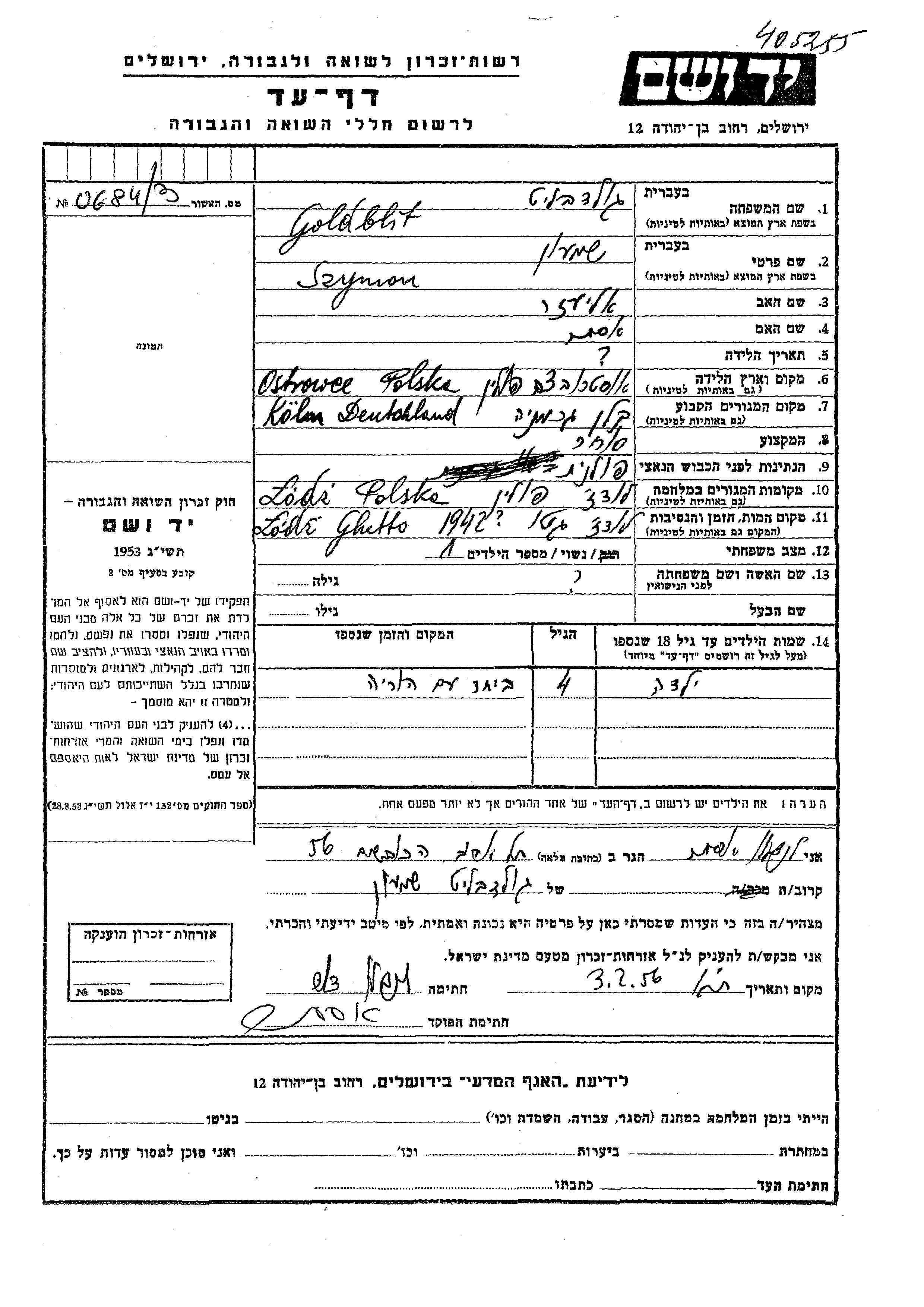 Vorname unbekannt Goldblit wurde Er/sie war der/ die Sohn/Tochter von Szymon. Er/Sie war Kind. Vor dem Zweiten Weltkrieg er/sie in Koeln, Deutsches Reich. Während des Krieges war er/sie in Lodz, Polen.