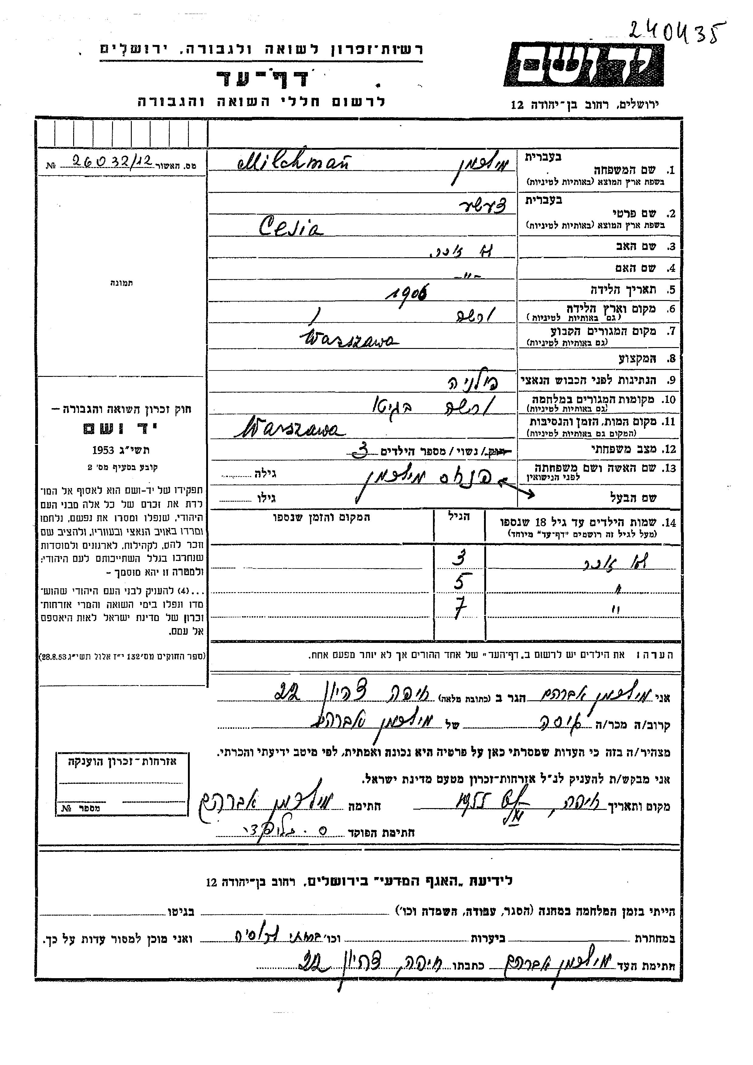 Vorname unbekannt Milchman wurde Er/sie war der/ die Sohn/Tochter von Pinkhas und Cesia. Er/Sie war Kind. Vor dem Zweiten Weltkrieg er/sie in Warszawa, Polen. Während des Krieges war er/sie in Warszawa, Polen.