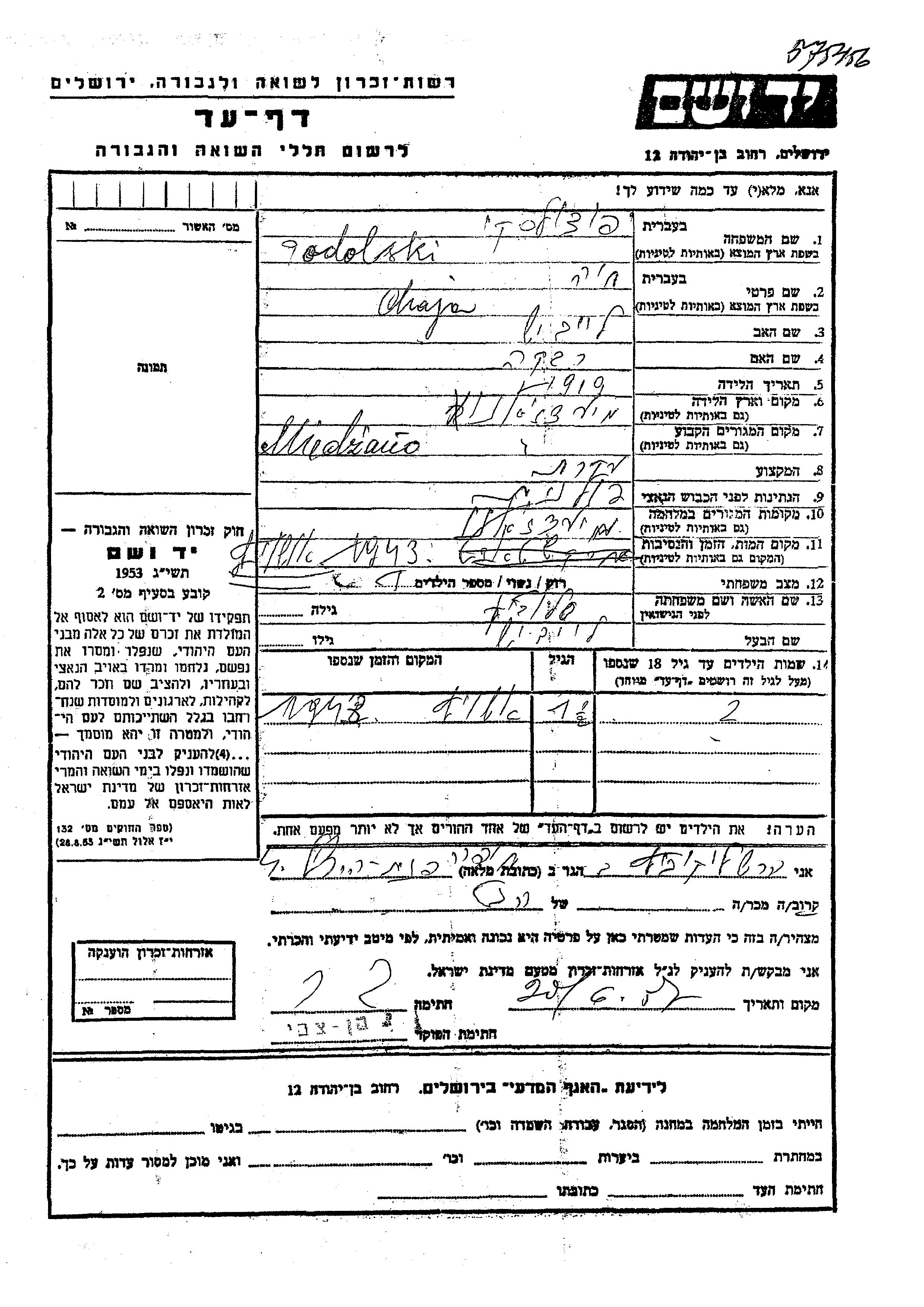 Vorname unbekannt Podolski wurde Er/sie war der/ die Sohn/Tochter von Chaja Khava, geb. Salovitz. Er/Sie war Kind. Vor dem Zweiten Weltkrieg er/sie in Miedzano, Polen. Während des Krieges war er/sie in Miedzano, Polen.