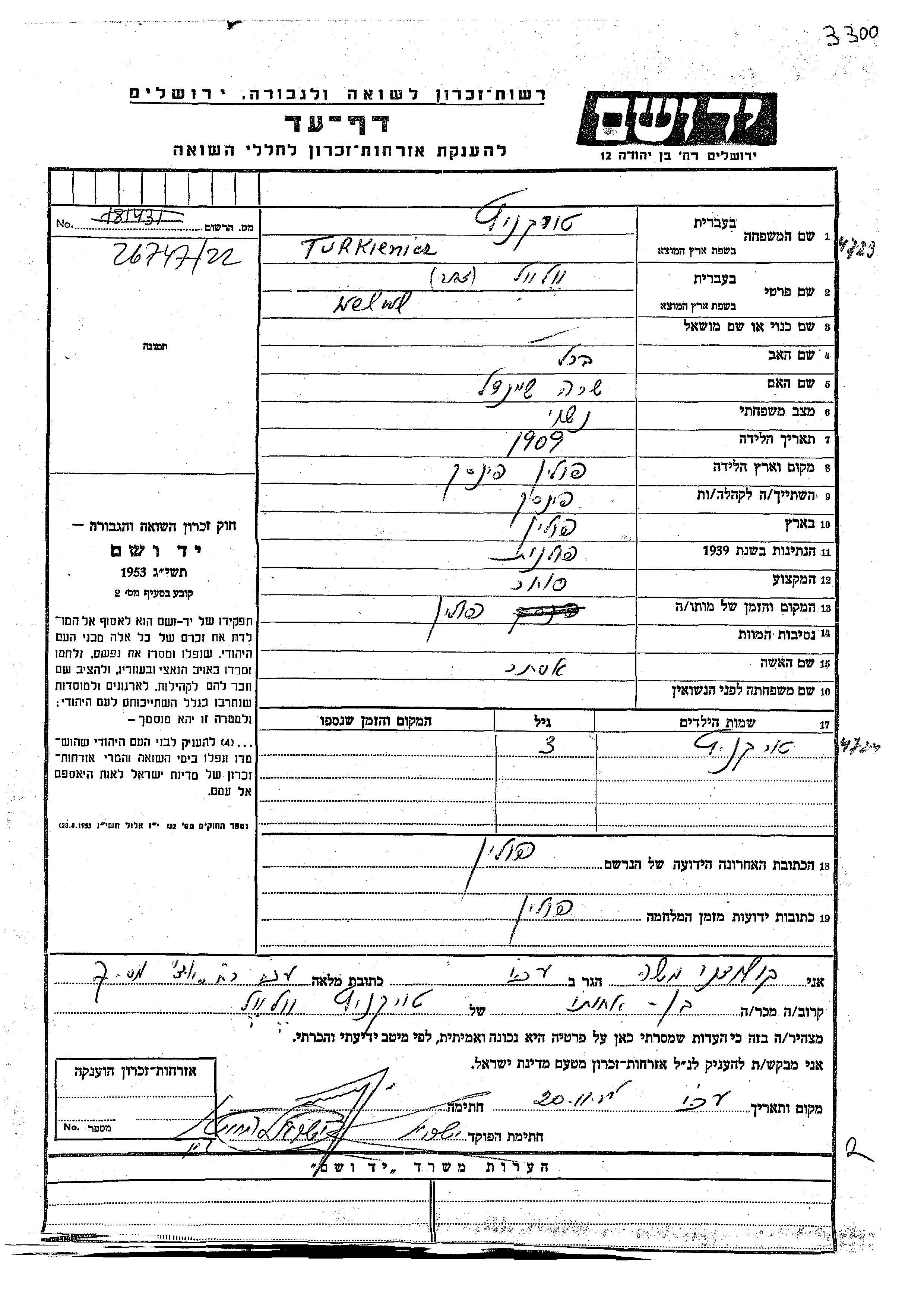 Vorname unbekannt Turkienicz wurde Er/sie war der/ die Sohn/Tochter von Welwl Zeev und Ester. Er/Sie war Kind. Vor dem Zweiten Weltkrieg er/sie in Pinsk, Polen. Während des Krieges war er/sie in Polen.