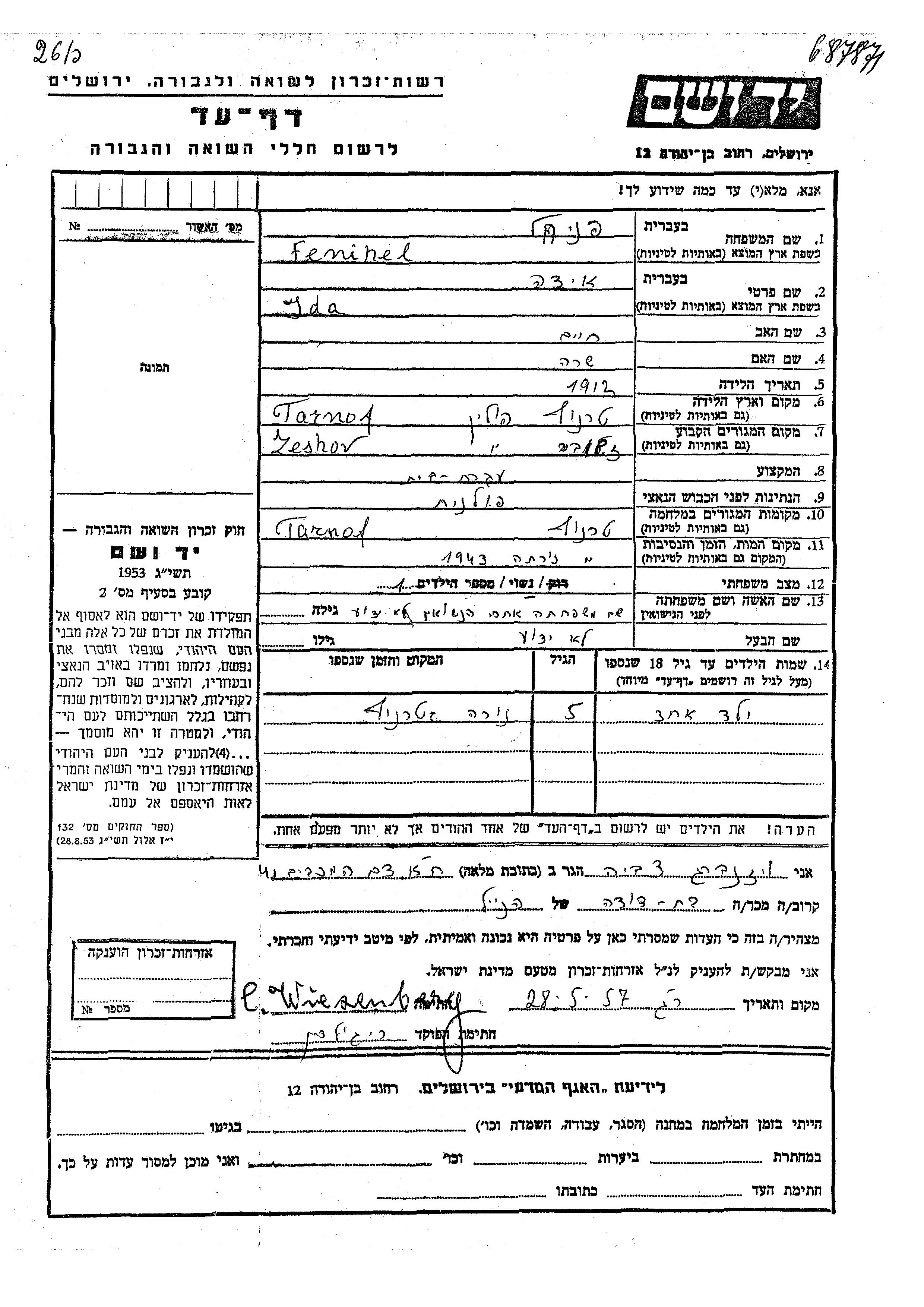 Vorname unbekannt Fenihel wurde Er/sie war der/ die Sohn/Tochter von Ida, geb. Fenihel. Er/Sie war Kind. Vor dem Zweiten Weltkrieg er/sie in Zeshov, Polen. Während des Krieges war er/sie in Tarnof, Polen.