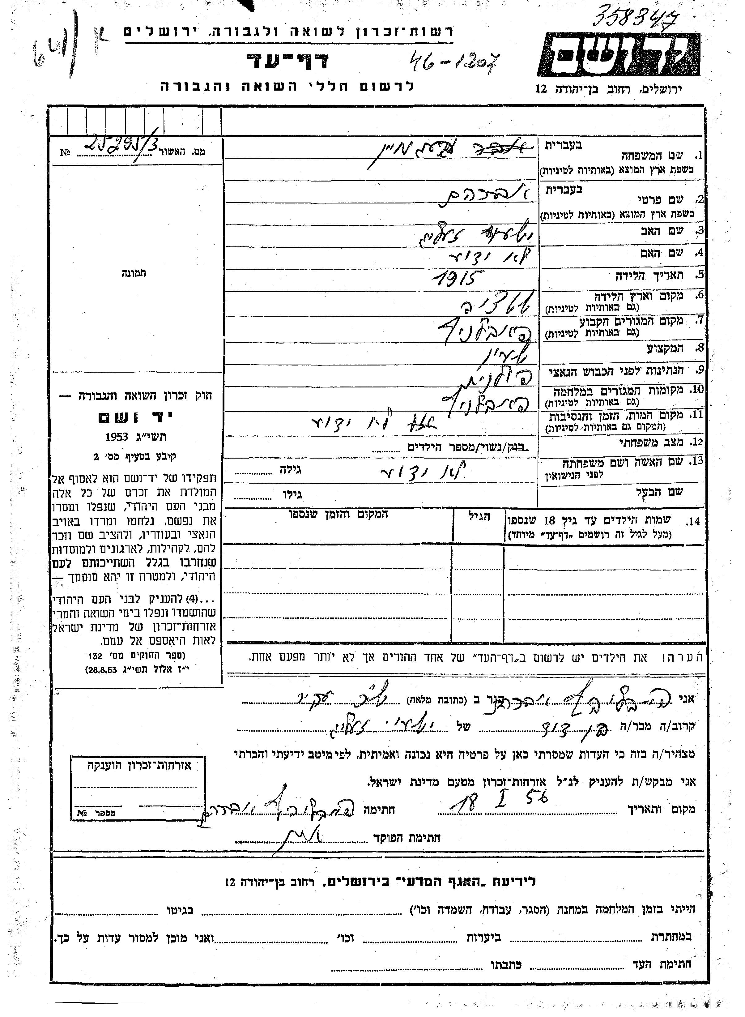 Avraham Begmein wurde im Jahr 1915 in Szczercow, Polen geboren. Er war der Sohn von Yeshayahu Zelig. Er war Uhrmacher/-in und Verheiratet. Vor dem Zweiten Weltkrieg lebte er in Pabianitz, Polen. Während des Krieges war er in Pabianitz, Polen.