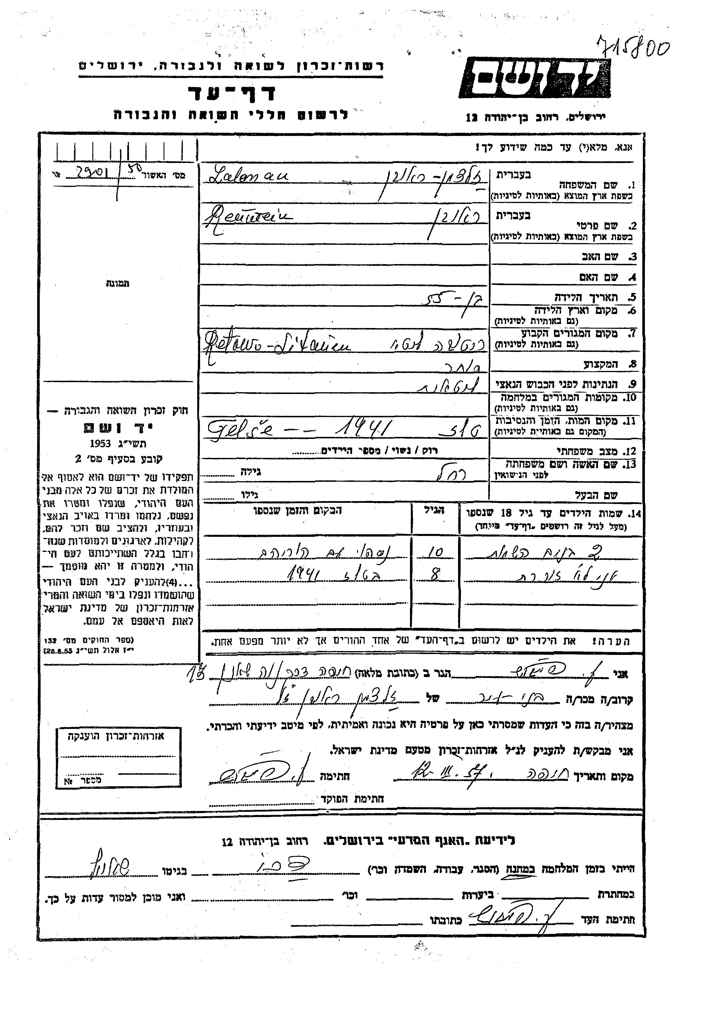 Zalman Vorname unbekannt Retawo, Litauen Gedenkblatt