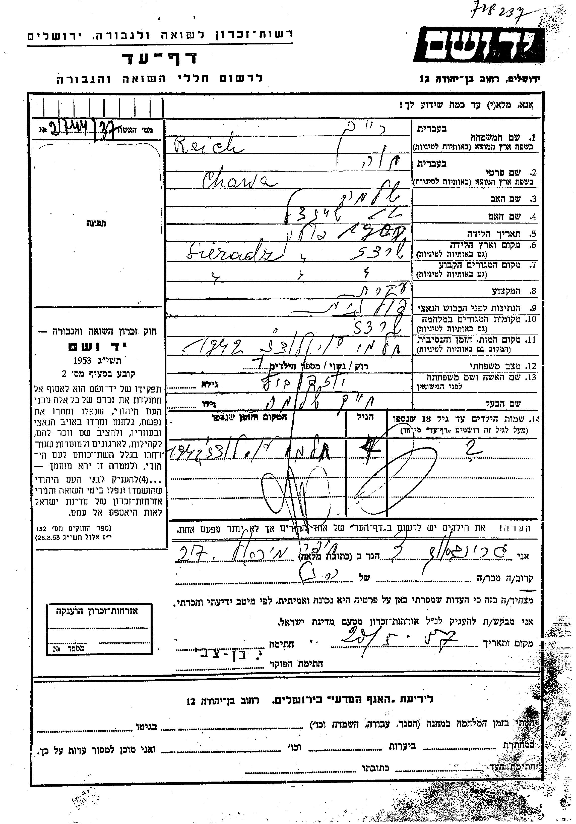 Vorname unbekannt Reich wurde Er/sie war der/ die Sohn/Tochter von Khaim Shlomo und Chawa, geb. Iuzefovich. Er/Sie war Kind. Vor dem Zweiten Weltkrieg er/sie in Sieradz, Polen. Während des Krieges war er/sie in Sieradz, Polen.