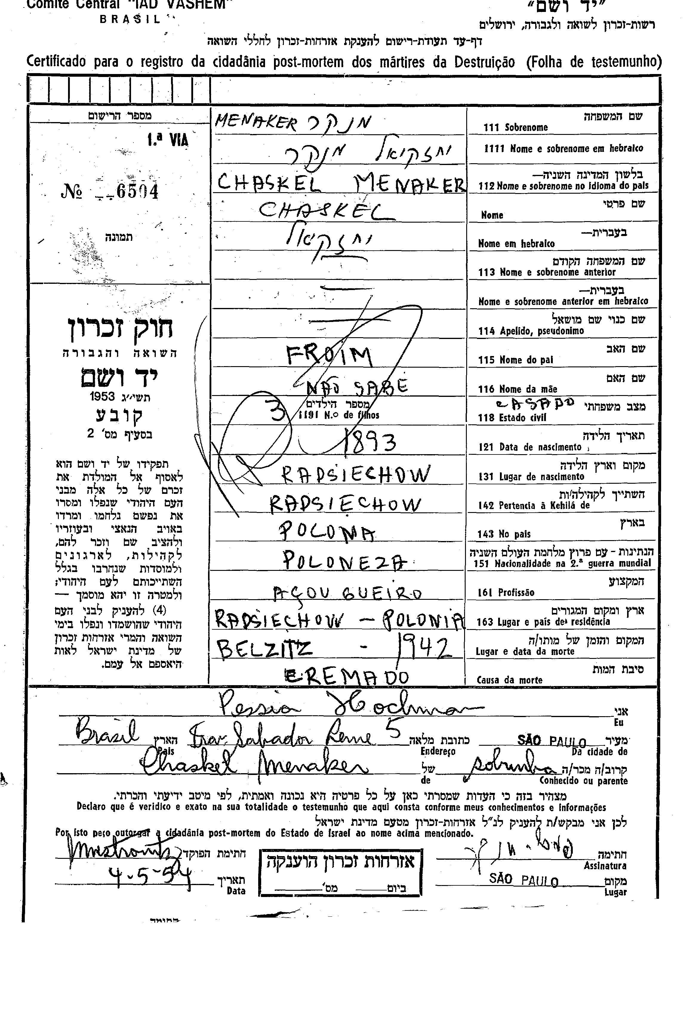 Chaskel Menaker Manker wurde im Jahr 1893 in Radechov, Polen geboren. Er war der Sohn von Froim. Er war Besitzer einer metzgerei und Verheiratet. Vor dem Zweiten Weltkrieg lebte er in Radechov, Polen. Während des Krieges war er in Radechov, Polen.