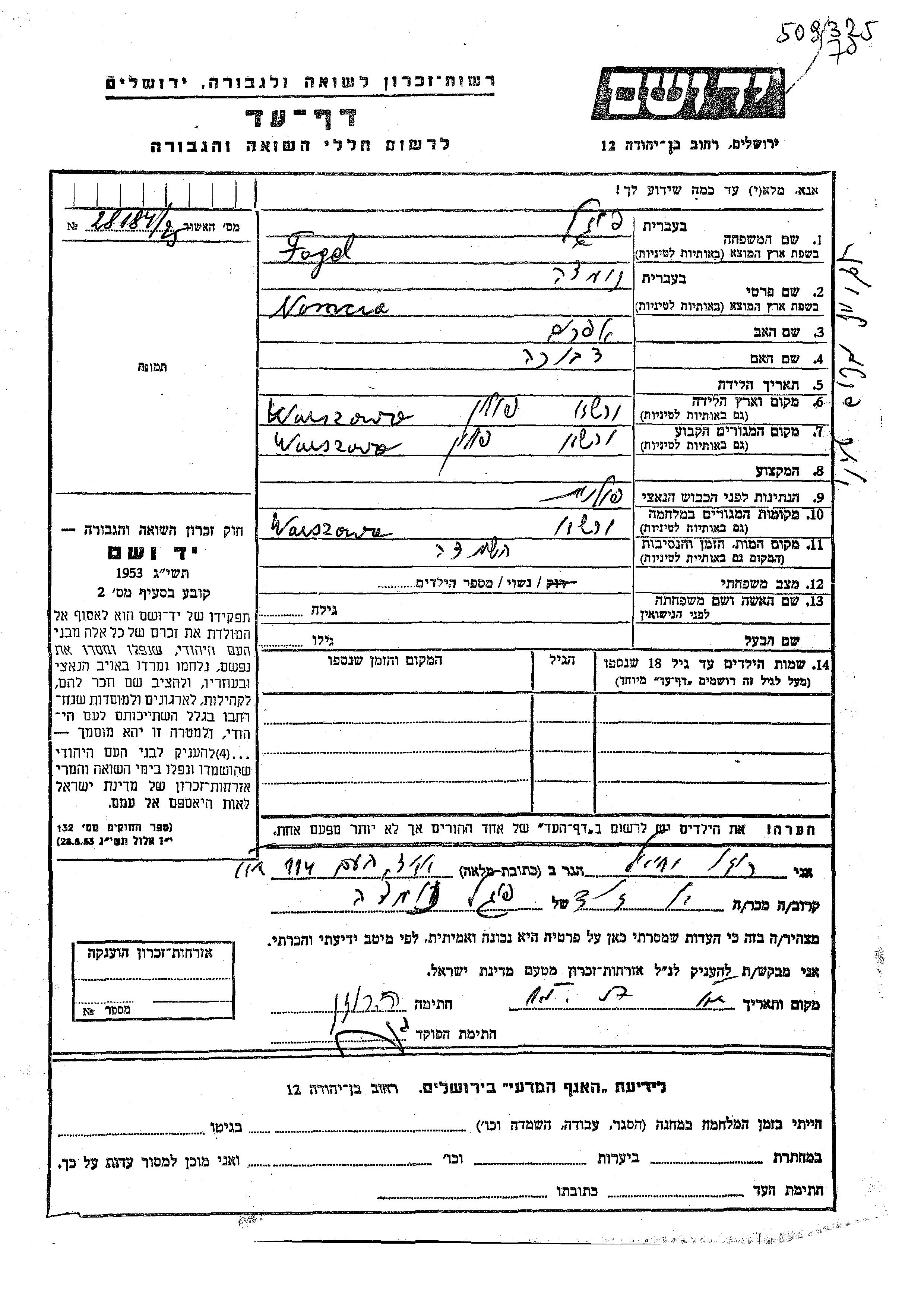 Nomcia Fogel wurde in Warszawa, Polen geboren. Sie war die Tochter von Efraim und Dvora. Sie war Verheiratet. Vor dem Zweiten Weltkrieg lebte sie in Warszawa, Polen. Während des Krieges war sie in Warszawa, Polen.
