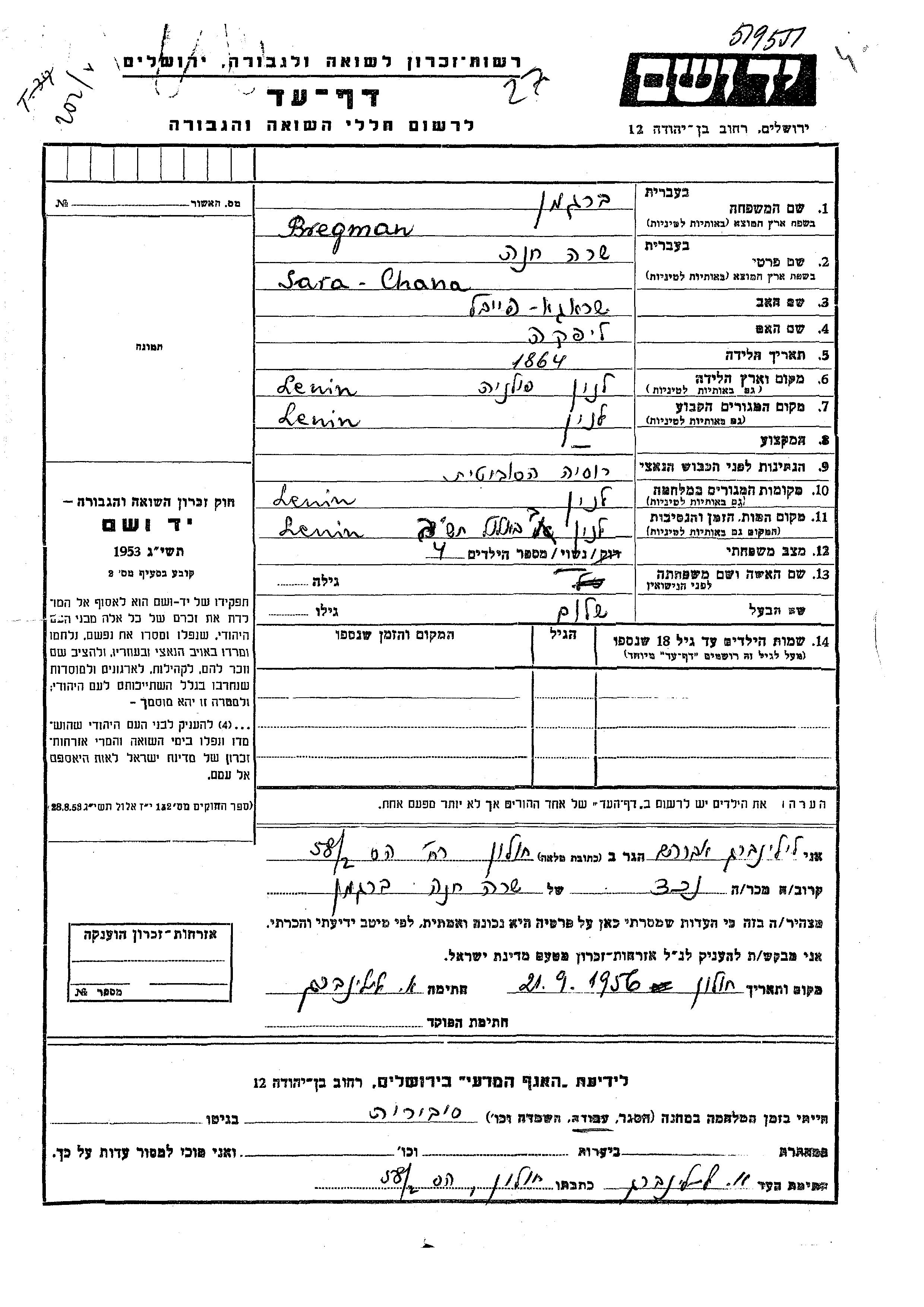 Chana Sara Bregman Bergman wurde im Jahr 1864 in Lenin, Polen geboren. Sie war die Tochter von Shraga Faivel und Lipka. Sie war mit Shalom Verheiratet. Vor dem Zweiten Weltkrieg lebte sie in Lenin, Polen. Während des Krieges war sie in Lenin, Polen.