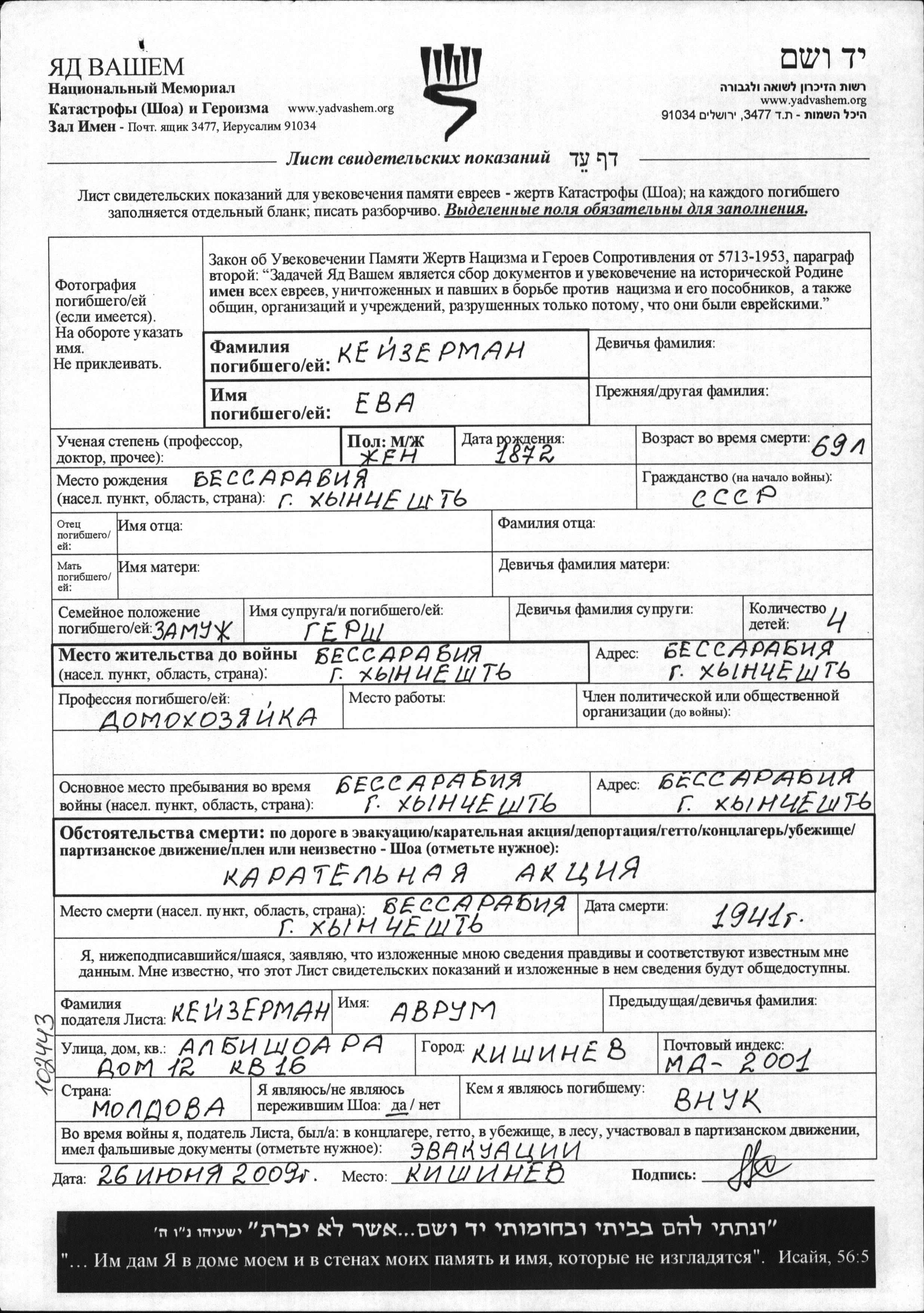 Yeva Keizerman wurde im Jahr 1872 in Hincesti, Rumänien geboren. Sie war Hausfrau und mit Gersh Verheiratet. Vor dem Zweiten Weltkrieg lebte sie in Hincesti, Rumänien. Während des Krieges war sie in Hincesti, Rumänien.