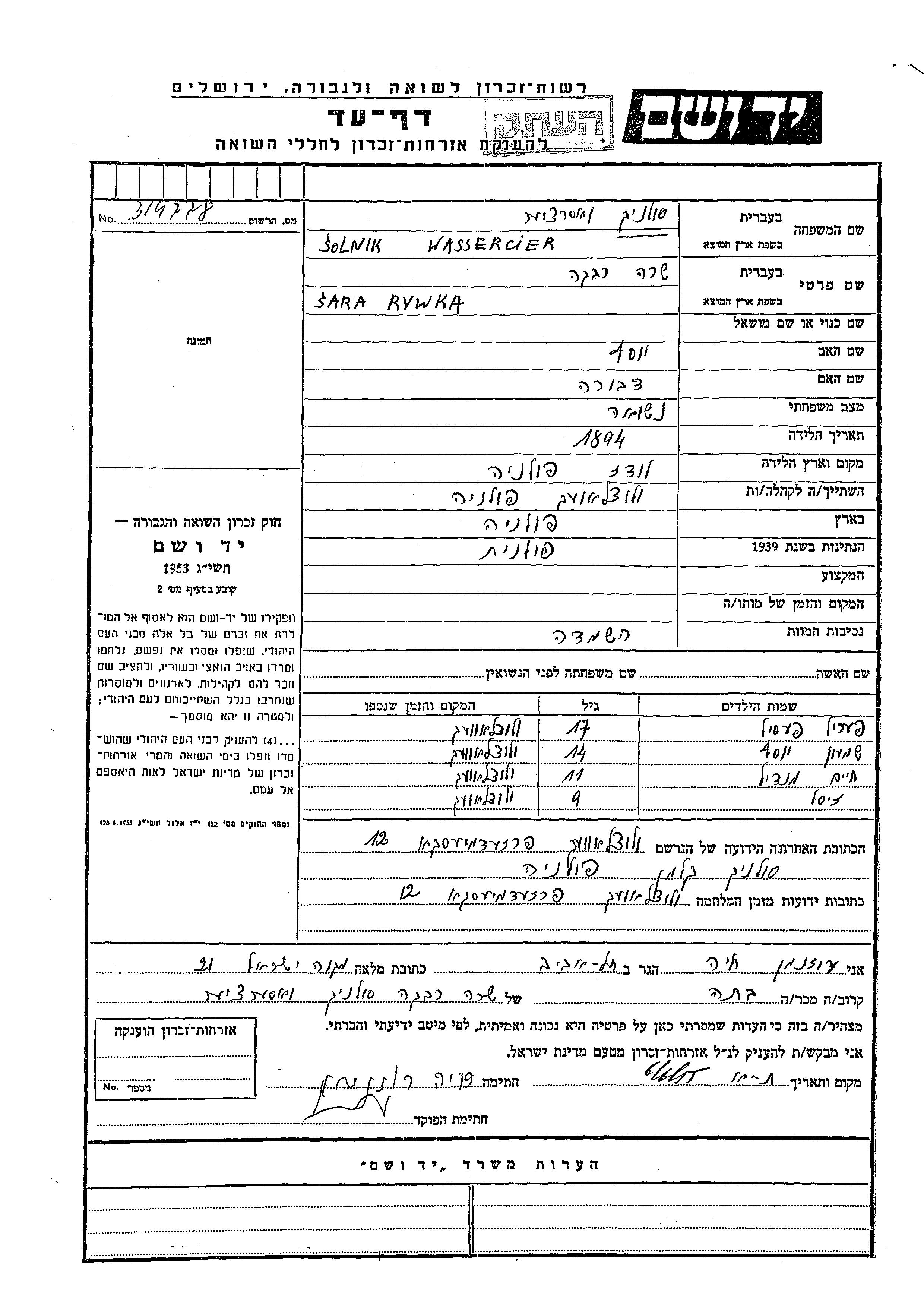 Rywka Sara Wassercier Solnik wurde im Jahr 1894 in Lodz, Polen geboren. Sie war die Tochter von Yosef und Dvora. Sie war Verheiratet. Vor dem Zweiten Weltkrieg lebte sie in Wloclawek, Polen. Während des Krieges war sie in Wloclawek, Polen.