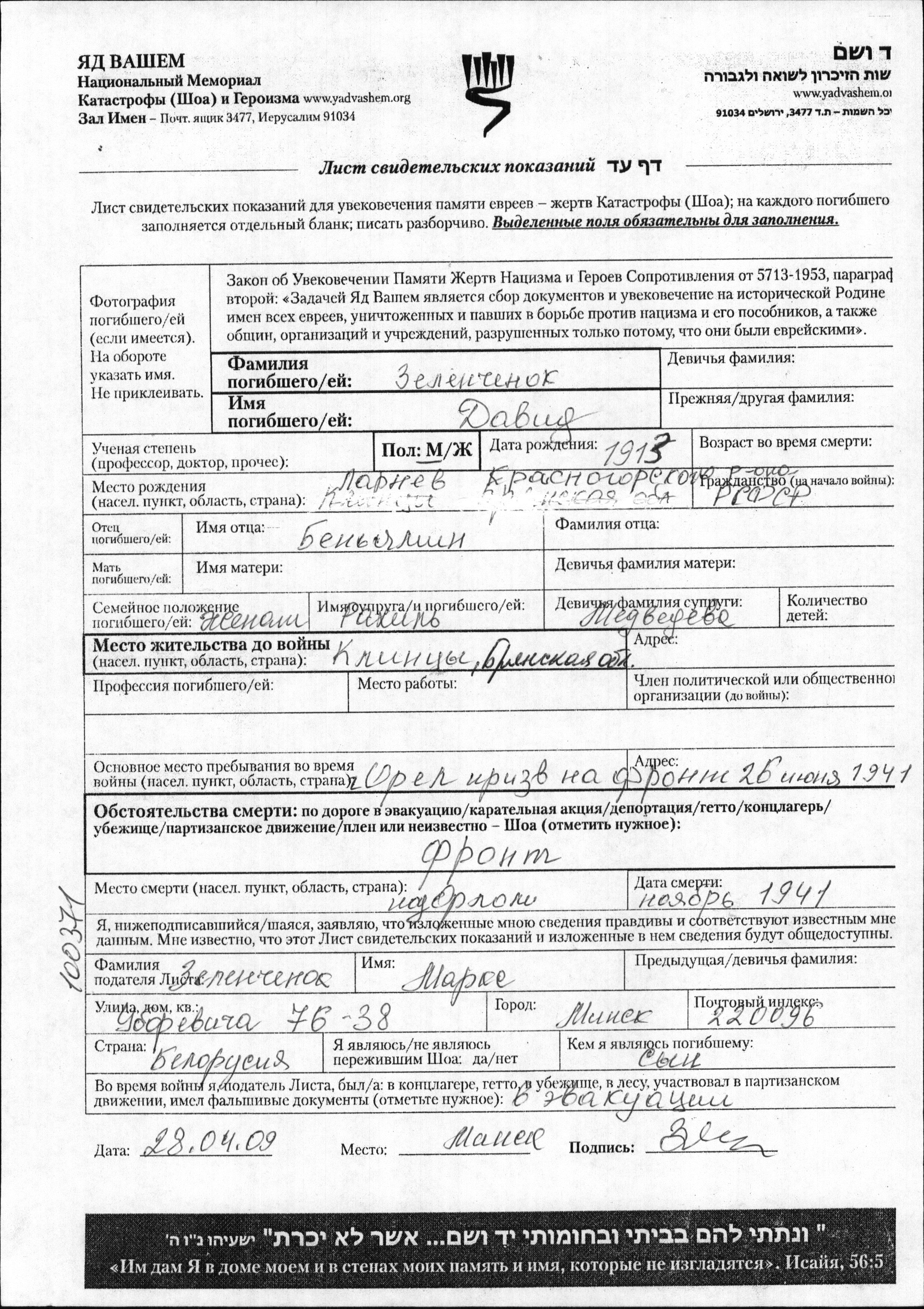 David Zelenchyonok wurde im Jahr 1913 in Larnevsk, Russland (UdSSR) geboren. Er war der Sohn von Benyamin. Er war mit Rakhil, geb. Medvedeva Verheiratet. Vor dem Zweiten Weltkrieg lebte er in Klintsy, Russland (UdSSR). Während des Krieges war er in die Sowjetischen Streitkräfte. David im Militärdienst umgekommen. Todesort: Orel, Russland (UdSSR) im Jahr 11/1941.