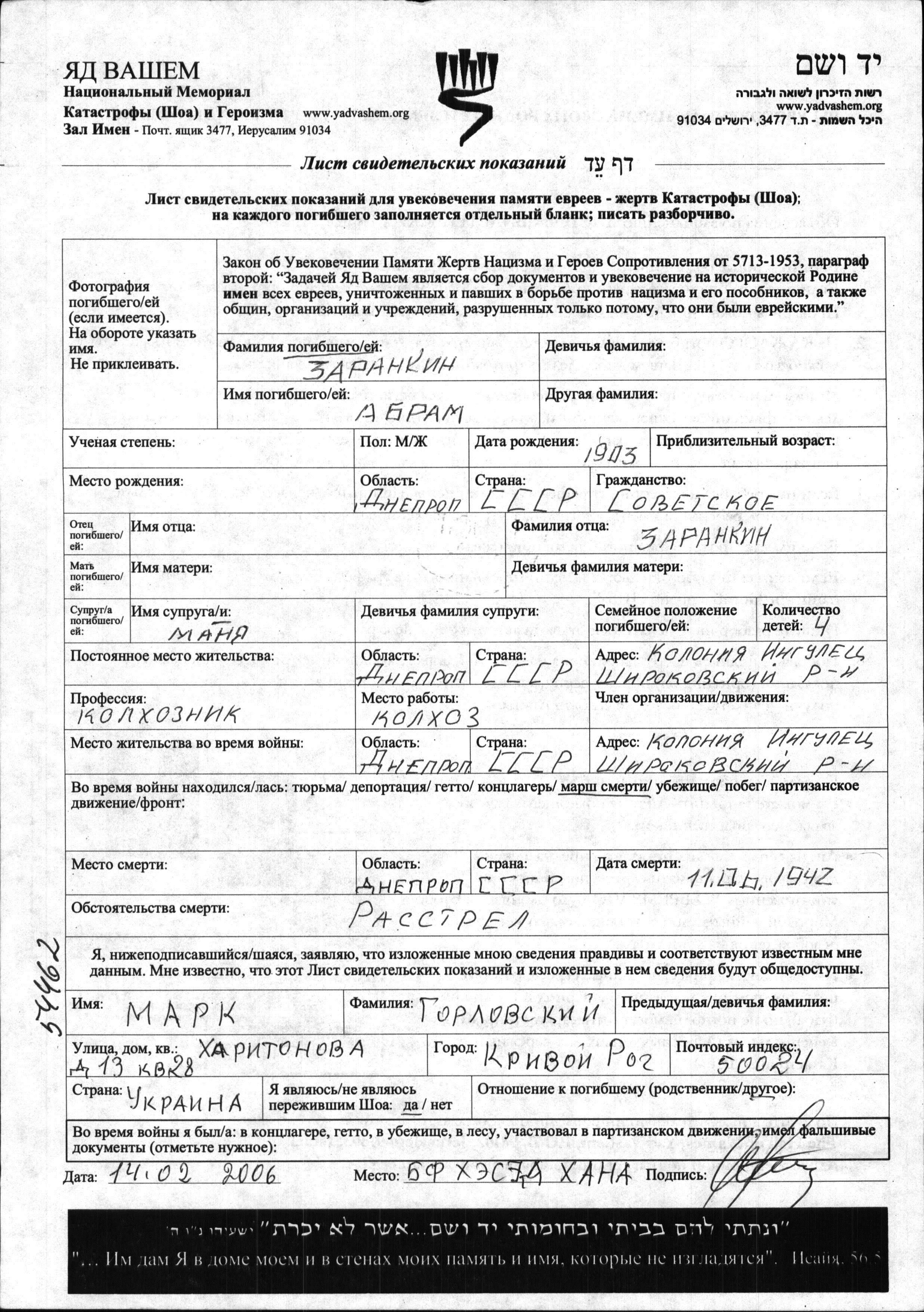 Abram Zarankin wurde im Jahr 1903 in Dnepropetrovsk, Ukraine (UdSSR) geboren. Er war Kolchosbauer/-bäuerin und mit Manya Verheiratet. Vor dem Zweiten Weltkrieg lebte er in Ingulets, Ukraine (UdSSR). Während des Krieges war er in Ingulets, Ukraine (UdSSR).